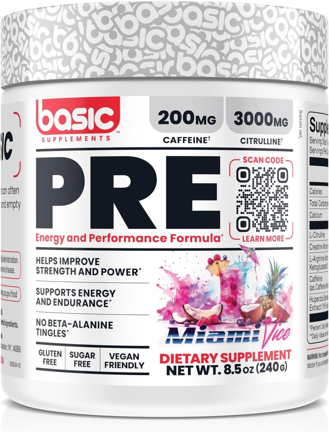 Pre-Workout with 200mg Caffeine and 3000mg Citrulline for Energy Focus and Strength Support No Beta-Alanine Tingles Vegan Gluten-Free Sugar-Free