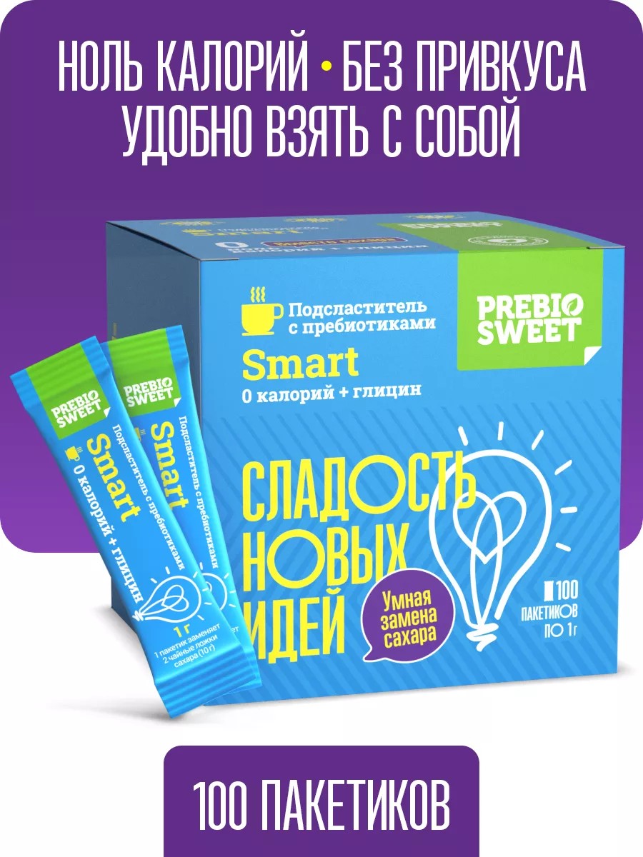 Сахарозаменитель Смарт с глицином. В 10 раз слаще сахара. В упаковке 100 стиков. Больше сладости, минимум калорий - максимум пользы здоровью. Антистресс: в составе содержится глицин - аминокислота, которая снижает психоэмоциональное напряжение, помогает бороться со стрессом при голодании и отказе от сахара и вредной еды. Лактулоза известна во всем мире как пребиотик для кишечника №1, который наилучшим образом стимулирует рост и жизнедеятельность полезной микрофлоры кишечника. Сукралоза рекомендована Всемирной организацией здравоохранения как безопасный заменитель сахарозы. Незаменим при безуглеводной диете для похудения и пп, на диабетическом здоровом питании и косметическом голодании, правильном диетическом питании для спортсменов. Альтернатива сахару при сахарном диабете. Существуют различные виды: сахзам в таблетках и саше, стевия порошок, аллюлоза, жидкий. Но признано, что самым безопасным для здоровья является натуральный эритритол или как его еще называют дынный сахар эритрол. Не имеет горечи как стевиозид. Продукт для диабетиков не просто относится к категории низкокалорийные продукты, а содержит 0 калорий. Используется как сахарозаменитель для выпечки, подсластитель для напитков и десертов, добавки в кофе и чай. Сахзам Prebiosweet Smart содержит подсластители эритрит и сукралозу, глицин и пребиотик лактулозу. No sugar