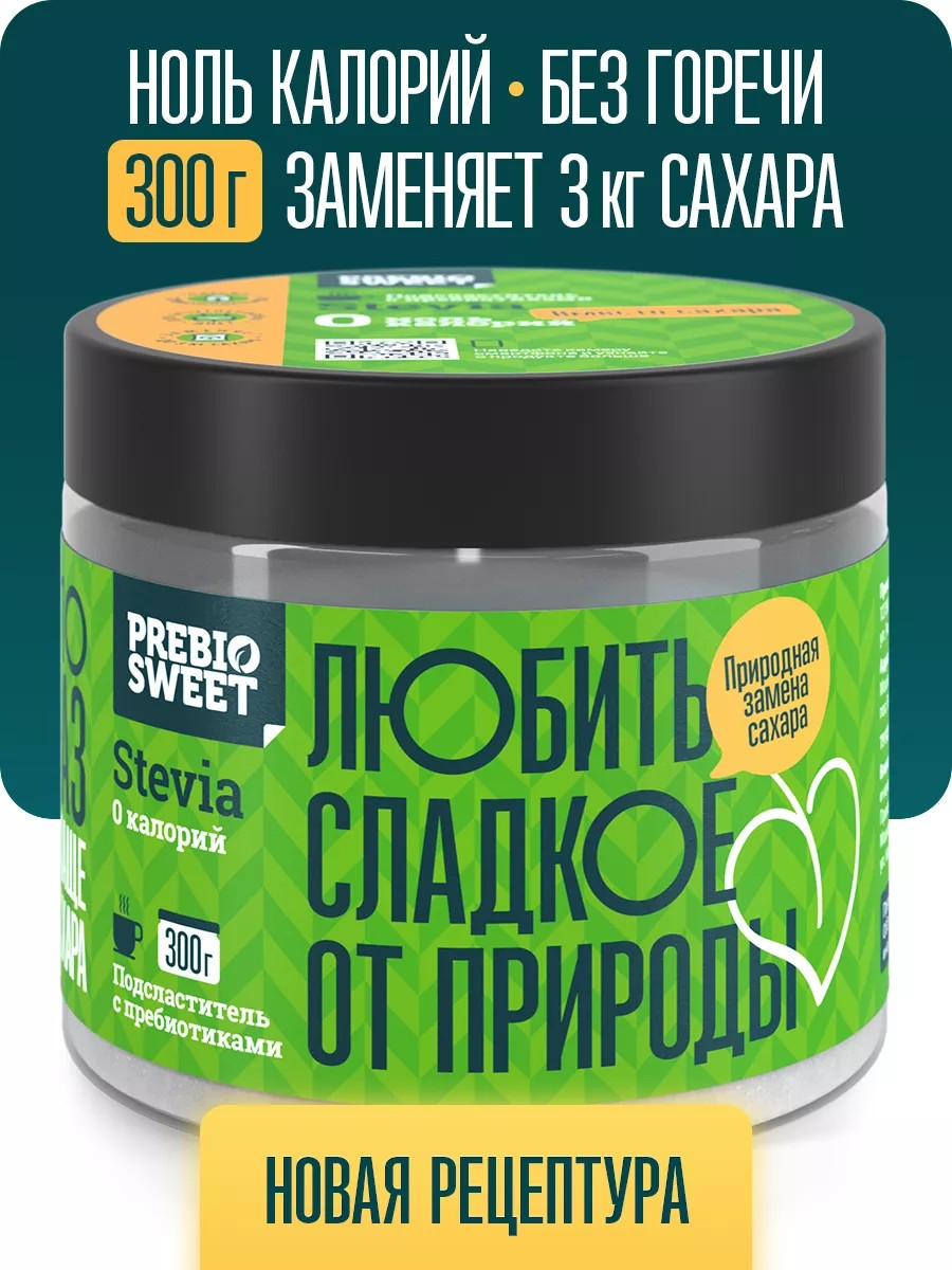 Kcal/calorie/carbohydrate: 0/0/0/0. A new balanced formula without a bitter aftertaste. The functional sweetener Prebiosweet Stevia is calorie-free and beneficial for digestion, 10 times sweeter than sugar. The prebiotic lactulose stimulates the growth of beneficial intestinal microflora. 1 scoop equals 10 g of sugar (2 teaspoons). Prebiosweet Stevia is a dietary sweetener for weight loss. It is indispensable for a low-carb diet for weight loss and healthy eating, for diabetic diets and cosmetic fasting, and for proper dietary nutrition (PP) for athletes. Suitable for vegans and the keto diet. It is used as a sweetener for baked goods, drinks and desserts, coffee and tea additives, and sugar-free sweets. It can be added to healthy foods. Any food for weight loss becomes healthier and more nutritious with it. Calorie-free. Carb-free. Pure sugar sweetness. Heat-stable (can be baked, frozen, etc.). Economical use. Convenient measuring spoon inside. Doesn't raise blood sugar levels. Suitable for type 2 diabetics. The sugar substitute does not stimulate insulin production.