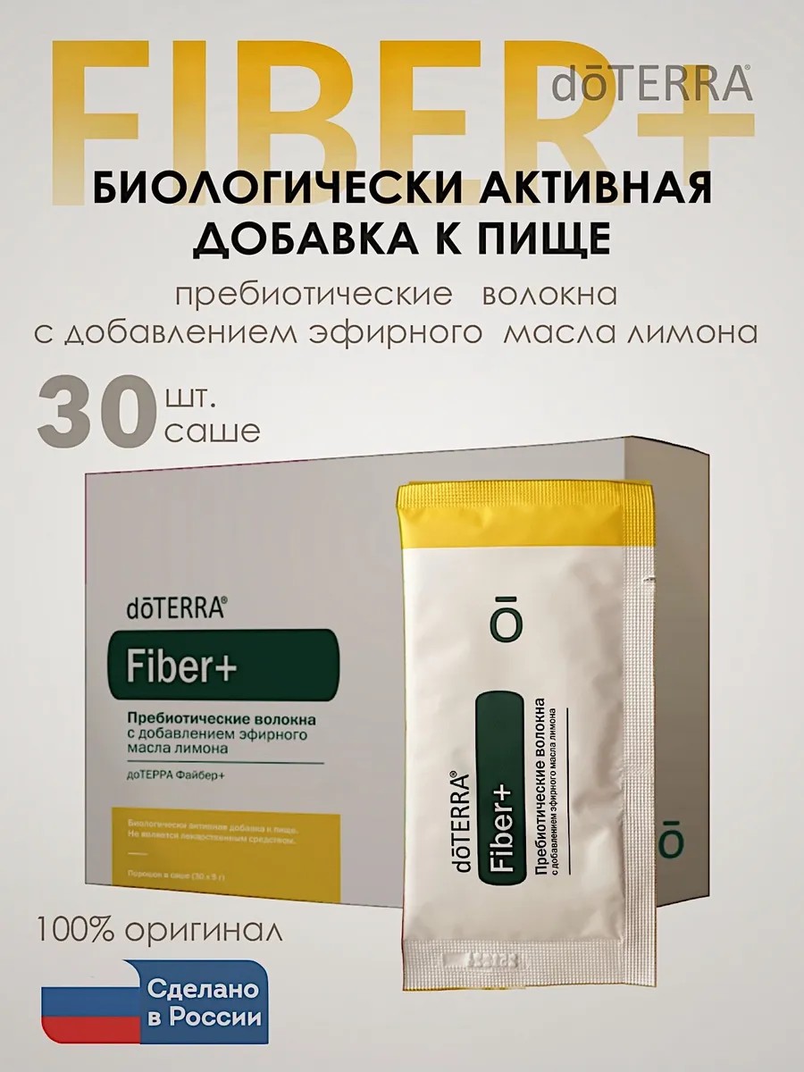 Уникальный пребиотический комплекс Fiber+ Файбер, учитывающий особенности и потребности микробиома жителей Евразии, не только питает полезную микрофлору кишечника, которая влияет на пищеварение, иммунитет, настроение и способность справляться со стрессом. Масло лимона стандарта CPTG оказывает мягкое детокс действие на организм, а также поддерживает функции печени и почек. В Fiber+ содержатся растворимые пищевые волокна из камеди акации, цикория и мякоти плодов баобаба, необходимые для поддержания метаболических процессов в организме. Одна порция Fiber+ содержит 3 грамма растворимых пищевых волокон для питания полезной микрофлоры и поддержки иммунитета. Одно саше Fiber+ закрывает суточную потребность в растворимых пищевых волокнах.