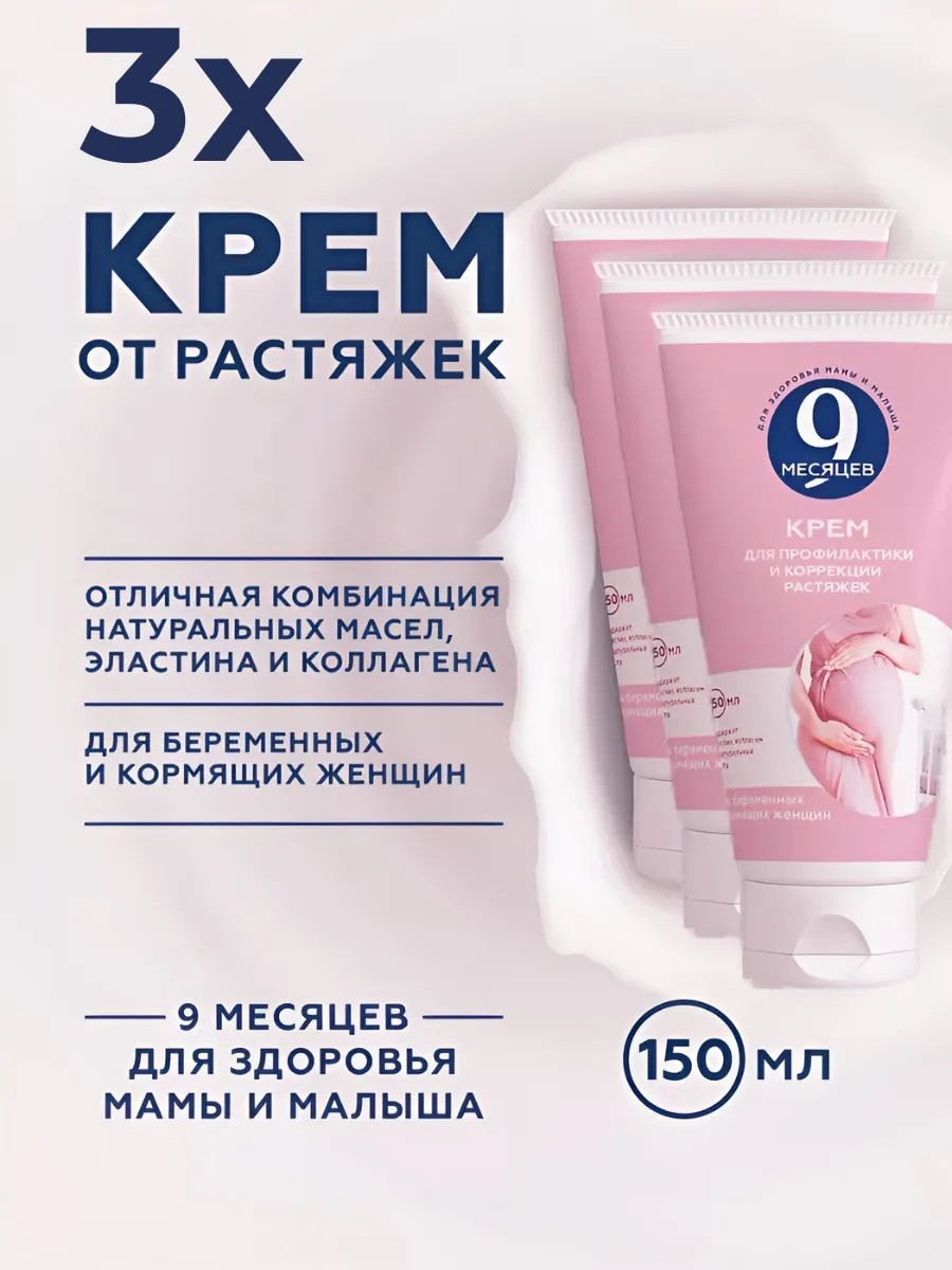 9 Месяцев Крем для профилактики и коррекции растяжек 9 месяцев - это продукт, разработанный специально для ежедневного профилактического ухода за проблемными участками тела (грудь, живот, бедра, плечи), склонными к образованию растяжек во время беременности. Крем, объемом в 150 мл, содержит в своем составе натуральные компоненты, которые помогают укрепить кожу, улучшить ее эластичность и гладкость. При систематическом применении способствует предотвращению образования растяжек (стрий) благодаря сбалансированному составу. Благодаря своему легкому и быстро впитывающемуся составу, крем может использоваться ежедневно утром и вечером, идеально подходя для ухода за кожей в период беременности и в период после родов. Наносите крем легкими скользящими массажными движениями равномерно на чистую кожу тела в областях, которые склонны к появлению растяжек; избегайте растягивания кожи.