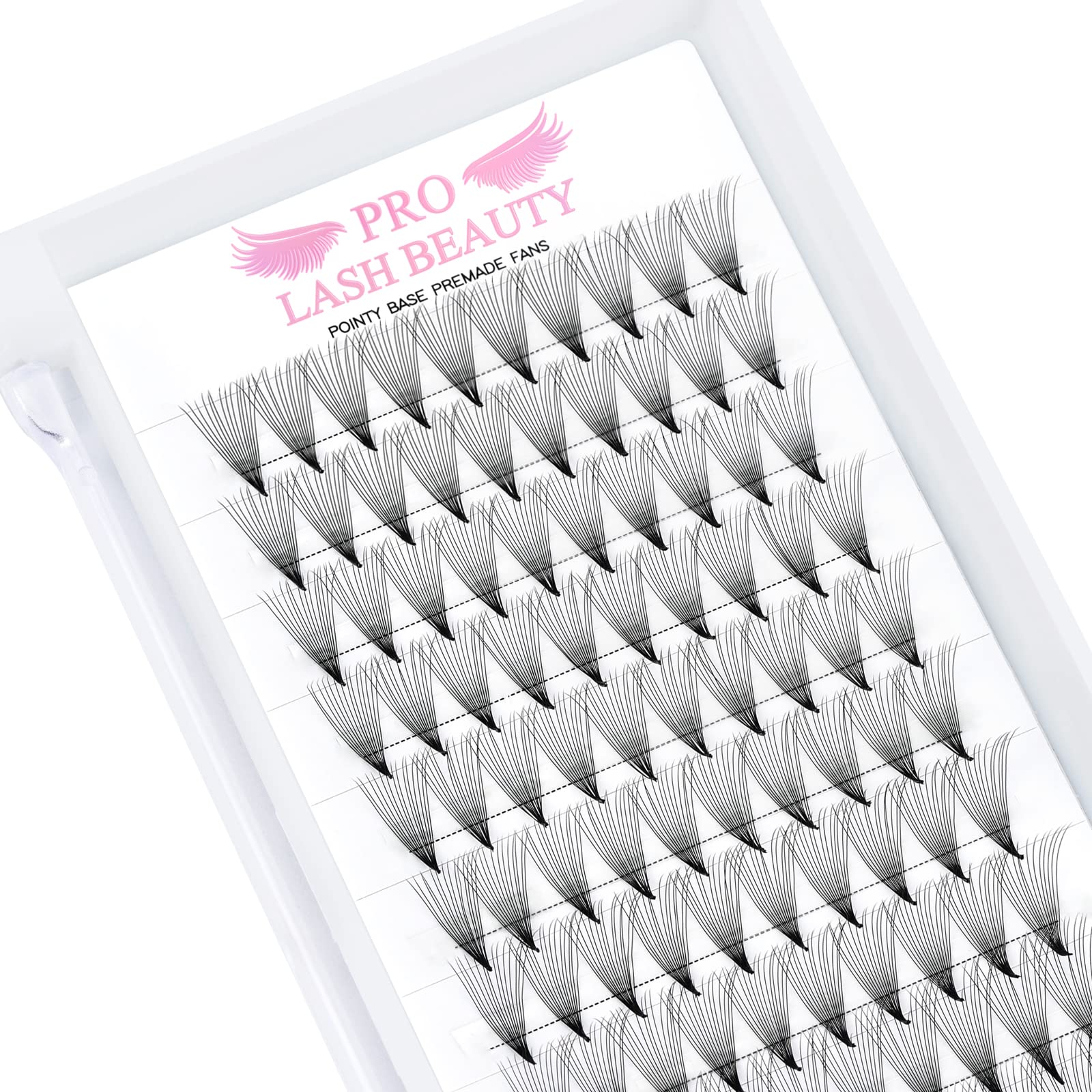 Service:If there are any questions we'd love to hear from you!Thank you for your trust and shopping with us!. Extremely Light Weight : Pointed base Fans are made from high quality PBT synthetic materials in order to reach stronger root and longer wear-time . Also the premade volume lashes are extremely light with lightly attached to the strip which means you can get it easily without efforts. Diverse Set Application: Premade Fans Eyelash Extensions are bonded together at the base which means they can be applied to a single natural lash to give a Hybrid/Volume/Mega look . For clients who have a few natural lashes , or want to cut down their application time. Invisible Pointy Base : The premade fans with the latest technology would not fall apart when take them off lash strip at the base of the fans. The stickiness of the base would leave no clumps of glue on the strip and match perfect with people’s own lashes. Specification : Pointy Base Premade Fans Eyelash Extensions have regular and large trays that per regular tray has 120 fans and per large tray has 320 fans . Available in 3-14D , 0.05/0.07/0.10 , C and D curl , 9 to 16 mm single length and 9-16 mix length .
