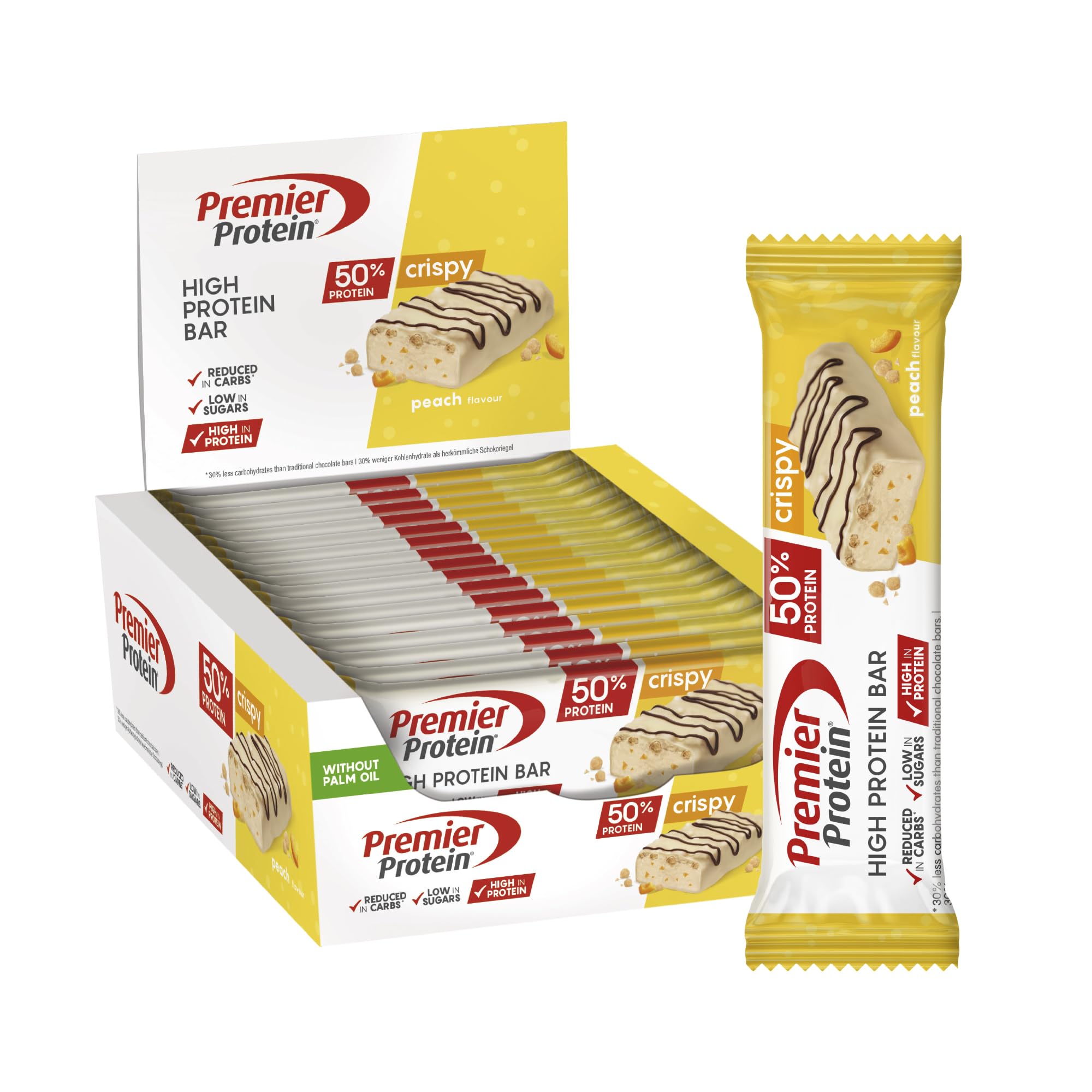 : Make every day your day. With plenty of movement and a varied, balanced diet. With lots of protein and little sugar. The delicious 50 protein bar from Premier Protein. With 20g of protein . And a maximum of 0.8g of sugar . per bar Ingredients White chocolate with sweetener (18 ) [sweetener (maltitol), cocoa butter, whole milk powder, emulsifier (lecithins)], calcium caseinate (milk), humectant (glycerol), collagen hydrolysate, soy protein, water, whey protein (milk), soy crispies (5 ) (soy protein, starch, salt), dark chocolate with sweetener [cocoa mass, sweetener (maltitol), cocoa butter, emulsifier (lecithins (soy))], preparation with peach puree [maltodextrin, peach puree (0.3 ), thickener (sodium alginate)], natural flavorings, emulsifier [lecithins (soy)], sweetener (sucralose). P.when('A').execute(function(A) { A.on('a:expander:toggle_description:toggle:collapse', function(data) { window.scroll(0, data.expander. expander[0].offsetTop-100) }) }) Instructions for use Consume as is See moreNO PALM OIL – A MORE RESPONSIBLE TREAT: No palm oil, but full of flavor. For everyone who values ??sustainability and quality. WHERE PLEASURE MEETS TEXTURE – AIRY, CREAMY CRISPY: A delicious peach flavor, a pleasant texture, and crunchy crispies for maximum snacking pleasure. LESS CARBS – MORE CONTROL: Compared to classic chocolate bars, this bar contains approximately 30 fewer carbohydrates. LOW IN SUGAR WITH ONLY 0.8g OF SUGAR PER BAR: Perfect for mindful eating, with great taste and no guilt. PACKED WITH PROTEIN: 50 protein per 40g bar. Highly concentrated and delicious for a protein boost on the go.Description du produit Pour que chaque jour soit ton jour. Avec beaucoup de mouvement et une alimentation variée et équilibrée. Avec beaucoup de protéine et peu de sucre. La délicieuse barre protéinée 50 de Premier Protein. Avec 20 g de protéine . Et 0,8 g maximal de sucre . par barre Ingrédients Chocolat blanc avec édulcorant (18 ) [édulcorant (maltitol), beurre de cacao, lait en poudre entier, émul- sifiant (lécithines)], caséinate de calcium (lait), humectant (glycérol), hydrolysat de collagène, protéine de soja, eau, protéine de lactosérum (lait), crispies de soja (5 ) (protéine de soja, amidon, sel), chocolat noir avec édulcorant [pâte de cacao, édulcorant (maltitol), beurre de cacao, émulsifiant (lécithines (soja))], préparation avec purée de pêches [maltodextrine, purée de pêche (0,3 ), épaississant (alginate de sodium)], arômes naturels, émulsifiant [lécithines (soja)], édulcorant (sucralose). P.when('A').execute(function(A) { A.on('a:expander:toggle_description:toggle:collapse', function(data) { window.scroll(0, data.expander. expander[0].offsetTop-100) }) }) Mode d'emploi Consommer tel quel Voir plusSANS HUILE DE PALME – UNE GOURMANDISE PLUS RESPONSABLE : Sans huile de palme mais pleine de saveur. Pour tous ceux qui privilégient durabilité et qualité. LE PLAISIR RENCONTRE LA TEXTURE – AÉRÉ, CRÉMEUX CROUSTILLANT : Une délicieuse saveur de pêche, une texture agréable et des crispies croquants pour un plaisir snack maximal. MOINS DE GLUCIDES – PLUS DE CONTRÔLE : Par rapport aux barres chocolatées classiques, cette barre contient environ 30 de glucides en moins. FAIBLE EN SUCRES AVEC SEULEMENT 0,8 g DE SUCRE PAR BARRE : Parfait pour une alimentation consciente, avec un excellent goût et sans culpabilité. PLEIN DE PROTÉINES : 50 de protéines par barre de 40 g. Hautement concentré et délicieux pour un boost de protéines à emporter.Premier Protein - High Protein Bar 50 Crispy - Peach - 16x40g - faible en sucres – pauvre en glucides – sans huile de palme Peach 16 x 40g