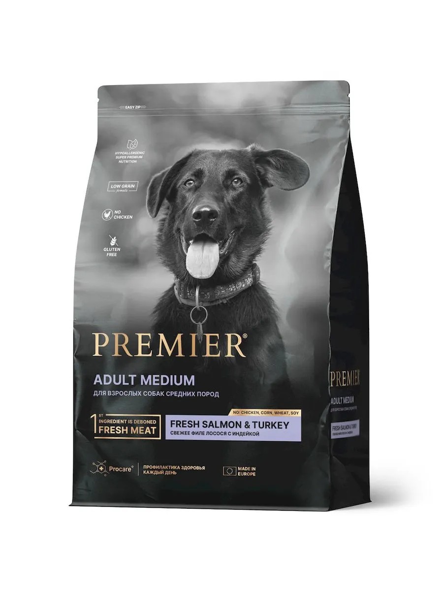 | Полное наименование товара | Премьер для собак средних пород с лососем и индейкой / Premier Dog Salmon&Turkey Adult Medium, 10 кг |