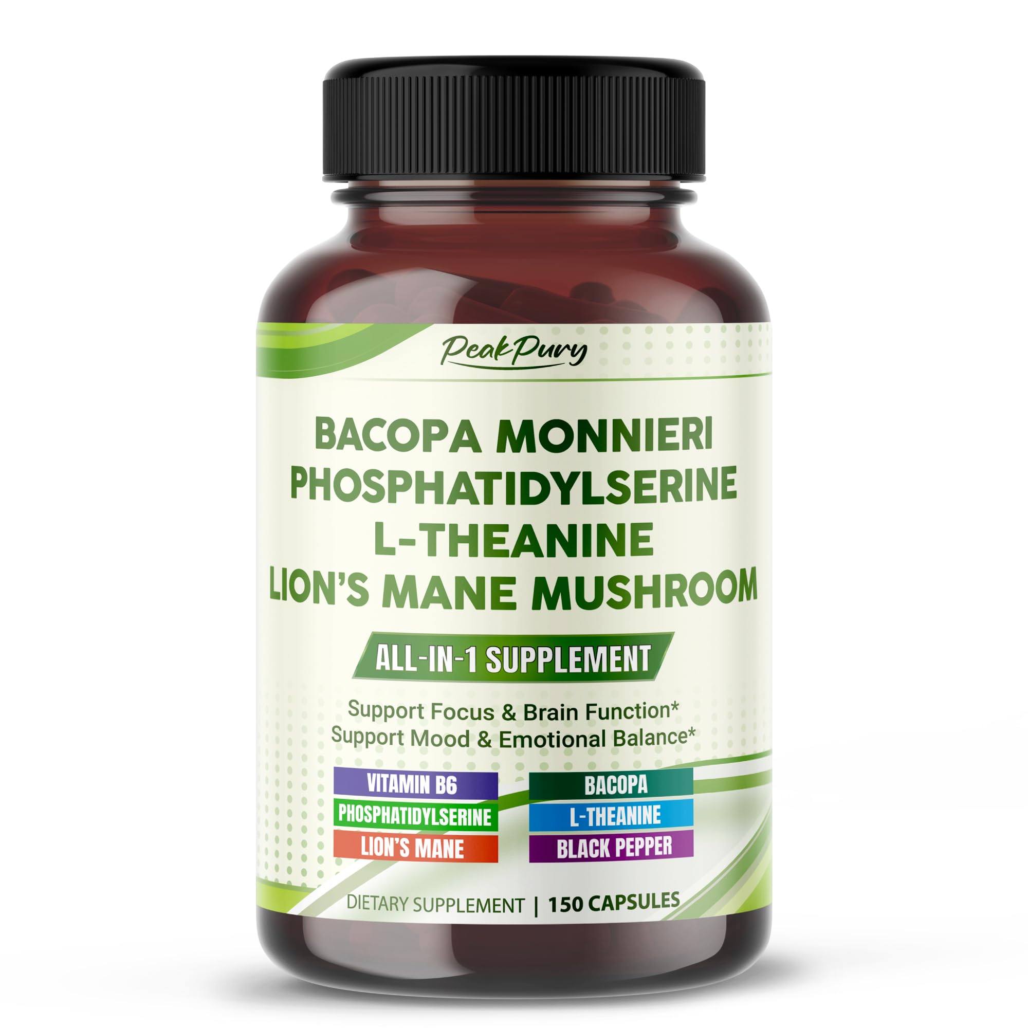 CRAFTED FOR PEACE OF MIND: Made in GMP-certified facilities with clean, reliable ingredients, free from the junk you don't want. This is straightforward, honest support you can count on to feel your best, every single day. ONE CAPSULE, LONG-LASTING VALUE: Get lasting support with 150 capsules per bottle. Just one capsule a day for a full 5-months supply, no complex routine, just gentle every day care for your brain and mood. 13-IN-1 ADVANCED FORMULA: Our complete formula combines 13 science-backed ingredients to support brain function, mood stability, and mental energy, helping you feel more balanced, focused, and in control in a single daily capsule. SUPPORT EMOTIONAL MOOD BALANCE: Supports emotional balance and keeps your mind at ease, our formula provides you with calming ingredients like Phosphatidyserine and L-Theanine, helping promote a stable mood throughout the day. SUPPORT COGNITIVE FUNCTION: Powered by 600 mg of organic Bacopa, PeakPury helps support memory, mental clarity, and sharp focus, so you can stay productive and clear-headed, even on your busiest, most demanding days.