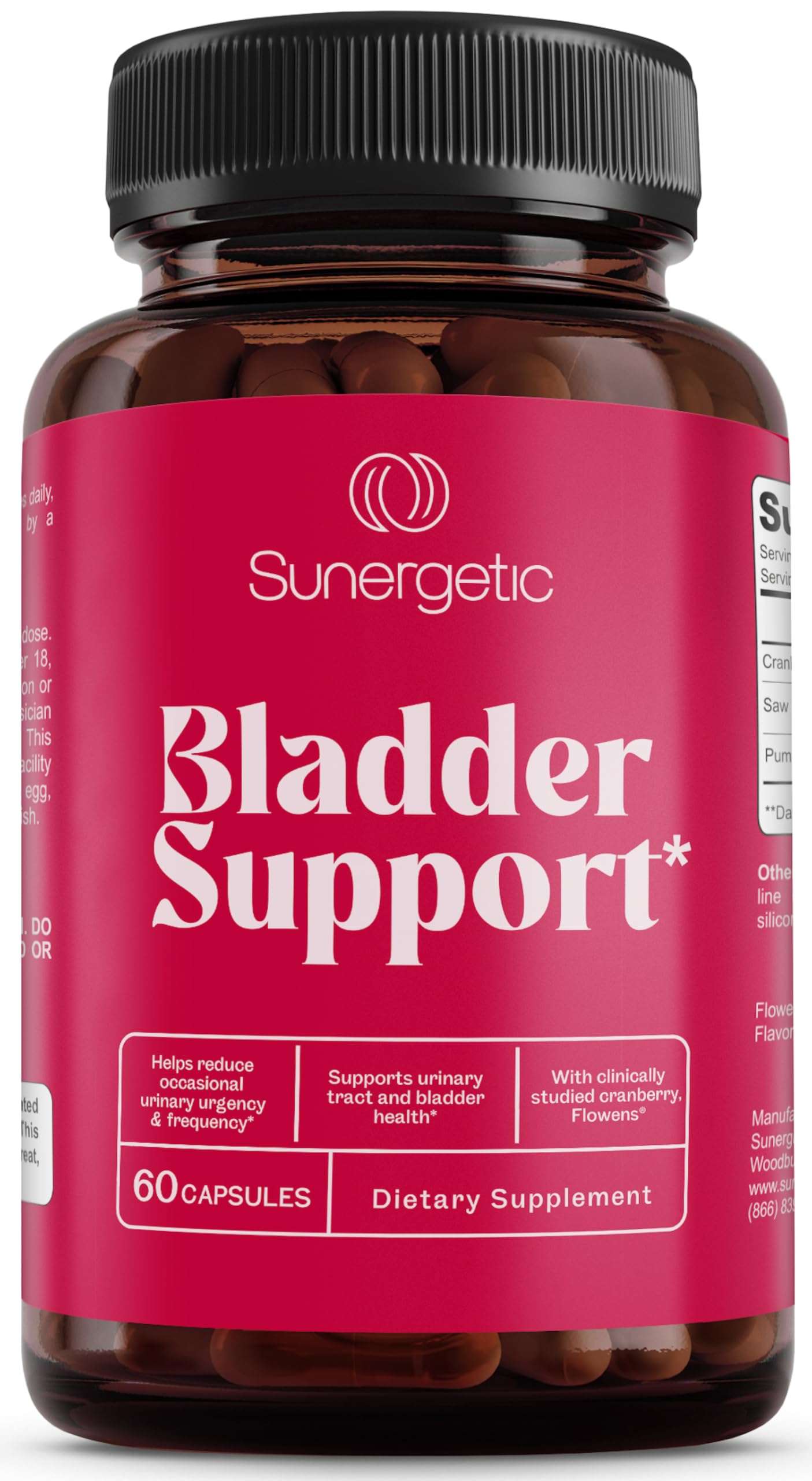 MADE IN USA: Our bladder support supplement for women is manufactured in the USA with domestic and imported ingredients in an FDA registered and NSF certified facility that adheres to Good Manufacturing Practices (GMP). We routinely third party test our bladder control supplement for heavy metals, micros and potency to a ensure high quality bladder supplement. WITH CLINICALLY STUDIED CRANBERRY: Unlike many other bladder control supplements, we use clinically studied Flowens, a powerful cranberry that has shown to help reduce occasional urinary urgency and frequency as well as support overall bladder, urinary tract and bone health. We included saw palmetto and pumpkin extract for additional bladder support and urinary tract health. Just take two capsules per day of our bladder support for women to help support normal urinary health and support healthy bladder function. OVERALL BLADDER URINARY TRACT SUPPORT: Are you looking to support overall urinary tract and bladder health? Our bladder control for women is formulated to help reduce occasional urinary urgency, frequency and leakage. Whether you have the urge to go at day or night, we know that's incredibly frustrating, so that's why we formulated our bladder support supplement, to help reduce the occasional urge to go. Use our bladder support supplement daily to help promote overall bladder and urinary tract function. URINARY URGENCY, FREQUENCY LEAKAGE: We understand that many activities including laughing, coughing, sneezing and exercise can cause occasional bladder urgency or frequency. With our natural bladder support supplement, our bladder formula is designed to help reduce occasional urinary urgency and frequency, as well as promote normal bladder health. With our bladder supplement, you can help manage those occasional frustrating nighttime or daytime visits to the bathroom. Get bladder and urinary tract support to help stay more comfortable throughout the day or night. POWERFUL BLADDER SUPPORT SUPPLEMENT: Sunergetic's bladder support supplement is formulated to help reduce occasional urinary urgency, frequency and leakage and to promote overall bladder and urinary tract health. Whether you have the urge to go at day or night, our bladder health supplement is formulated to help reduce the occasional urge to go. We use clinically studied Flowens, a unique cranberry that's shown to promote occasional urinary control and support health bladder function. Included is pumpkin seed extract and saw palmetto to help overall urinary tract health. Take control of your bladder health today!.