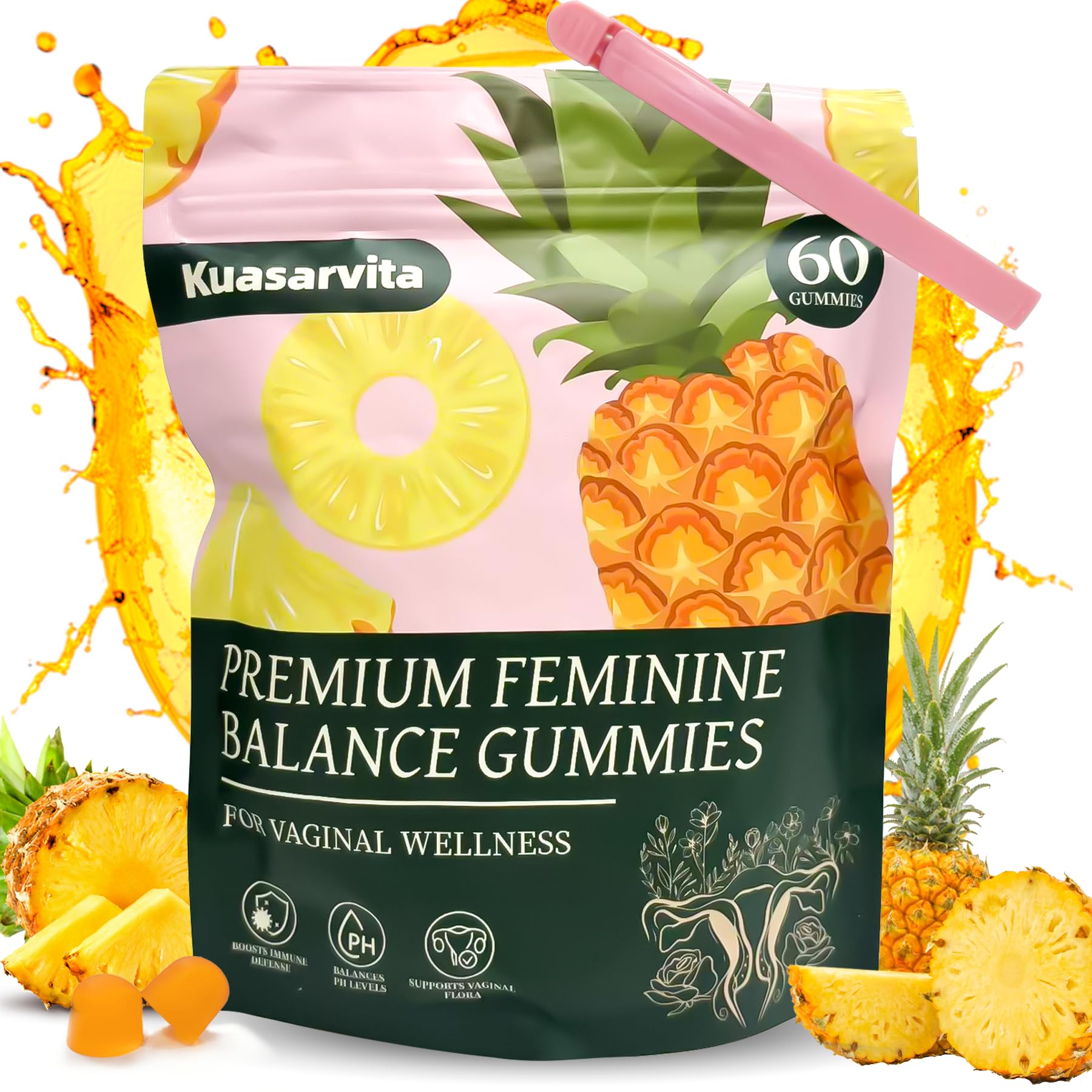 Refreshing Pineapple Sensation – Enjoy the refreshing taste of pineapple in every chew, making it easy to stay consistent with your feminine health routine. Monthly Wellness Regimen – Each bottle contains 60 count of premium gummies, providing a convenient monthly supply for your feminine health needs. Clean Ethical Ingredients – Made with vegan, gluten-free, and low-sugar ingredients, our gummies are a clean and ethical choice for feminine care. Immune Vaginal Support – The blend of probiotics in these vaginal gummies offers dual benefits of immune enhancement and vaginal health maintenance. Intimate Health Restorer – Feminine balance gummies for women work to restore and preserve vaginal health, ensuring a balanced pH for long-term comfort.