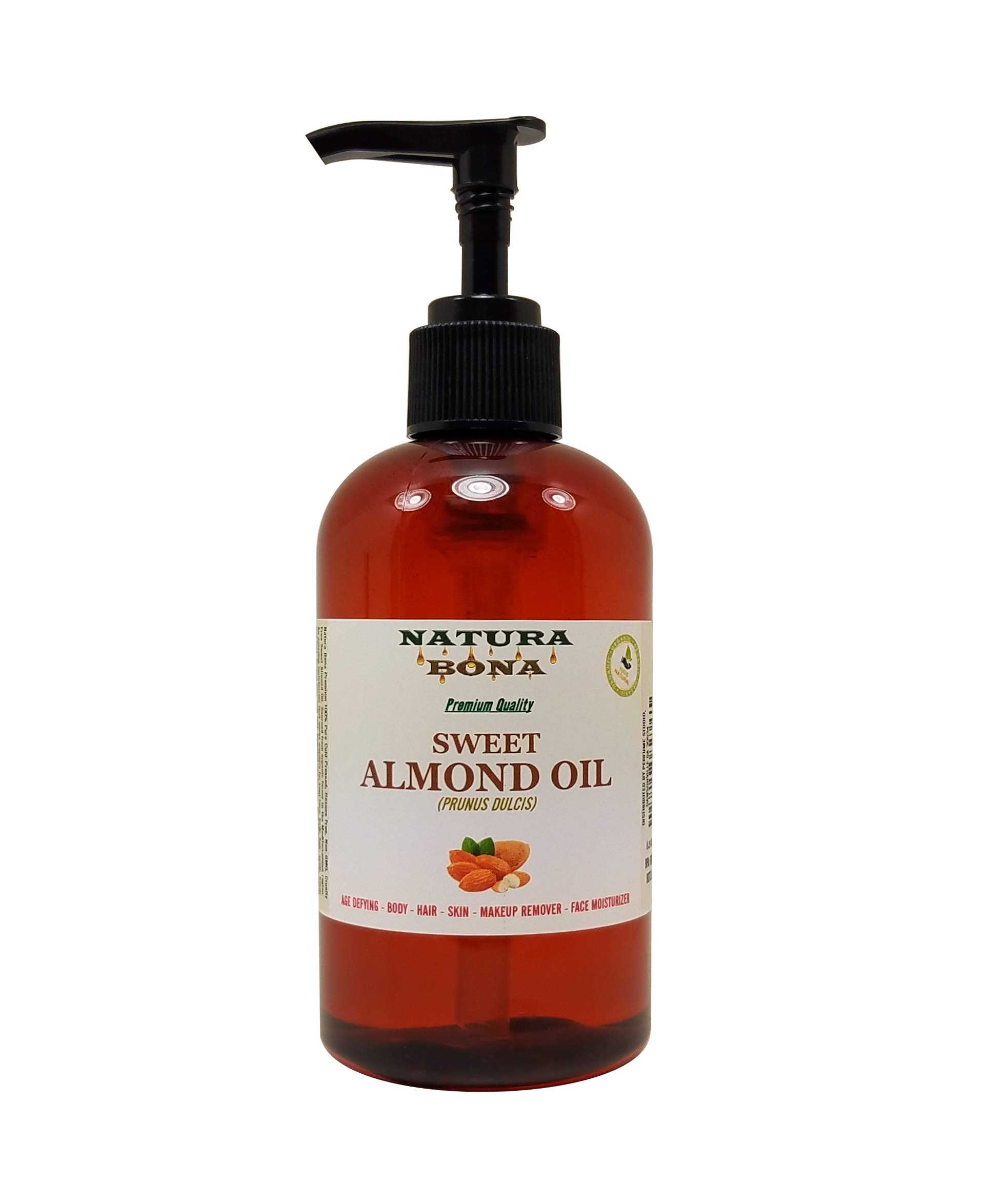 Natura Bona Premium 100 Pure Cold-Pressed Hexane Free, Non-GMO, Cruelty Free Sweet Almond Oil. Sourced from organic farms in the Mediterranean region. An amazing moisturizer that works wonders for your face, body, hair, scalp, nails, hands and feet leaving your skin soft, nourished, hydrated and healthy. Rich in omega-9, omega-6 fatty acids, Vitamin D E. Sweet almond oil is thought to bring the body back into balance. FOR YOUR HAIR: Your hair can benefit by being stronger, thicker, and shinier. Try using it as a pre-conditioner to washing, conditioning and styling in order to prevent split ends. Add after styling to prevent frizz and add shine. As a hair moisturizer, try massaging it directly into the roots to help ease the symptoms of dry scalp. While these benefits are already scientifically known, some believe that it can actually stimulate growth and lead to fuller and thicker hair. FOR YOUR SKIN: Use it as base oil for soaps and lotions. It brings the vitamins D and E directly to the epidermis and is suitable for all skin types. A popular carrier oil and base for skin lotions try adding it to your homemade skin care products. Excellent for every skin type it will calm itching, chapping, dryness and inflammation. Incorporate into your lip balms for a natural source of vitamin E and plump, healthy lips. Smooth away fine lines and wrinkles by gently rubbing the oil around your eyes and lips. Gently splash water on your face to rinse without irritation. FOR AROMATHERAPY: Almond oil doesn't penetrate skin as deeply as other oils and therefore is perfect for aromatherapy. Infuse with your favorite essential oil to create your own personalized perfume that will last for years. Try mixing it into your warm bath water for a stress reliving and skin moisturizing luxurious bathing experience. Add lavender and rosemary for a pain relieving massage on those tired feet and achy back. PRODUCT INFORMATION: NAME: Sweet Almond Oil PURPOSE: External Use Only Fragrance QUANTITY: 1 item INGREDIENTS: Sweet Almond Oil MANUFACTURER DISTRIBUTOR: Perfume Studio Ltd Co., Dawsonville GAEASY TO USE: Saddle Pump Bottle Made from Safe to Use BPA Free PET Plastic 8.3 Oz. LOADED WITH NUTRITION: Rich in omega-9, omega-6 fatty acids, Vitamin D E. Use to Moisturize Face and Enrich Skin and Hair and Aromatherapy Blends. Frequently used to help delay the signs of aging by stimulating the skin and renewing cells for a fresh and young appearance. Sweet Almond Oil is the ideal under-eye treatment, fighting dark circles and reducing the appearance of crow's' feet. It's the perfect odorless lubricant oil for skin. PREMIUM QUALITY: Natura Bona Premium 100 Pure Cold-Pressed Hexane Free, Non-GMO, Cruelty Free Sweet Almond Oil. Sourced from organic farms in the Mediterranean region. An amazing moisturizer that works wonders for your face, body, hair, scalp, nails, hands and feet leaving your skin soft, nourished, hydrated and healthy.
