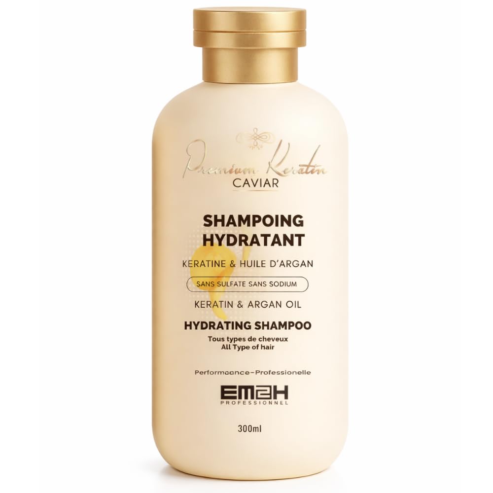 : This sulfate-free moisturizing shampoo gently cleanses while providing intense hydration and deep repair to dry, damaged, or weakened hair. Formulated with keratin, silk protein, panthenol, argan oil, and shea butter, it strengthens the hair fiber, reduces breakage, and prevents split ends. Its luxurious formula, free of sulfates and parabens, transforms into a creamy lather to effectively cleanse and detangle hair. It restores suppleness, softness, and shine. Perfect for chemically treated hair, it facilitates styling and leaves hair revitalized and protected. Benefits: Sulfate-free Intense hydration and deep repair Easy detangling and breakage protection Suppleness, shine Ingredients: Keratin Panthenol Argan oil Shea butter Silk protein P.when('A').execute(function(A) { A.on('a:expander:toggle_description:toggle:collapse', function(data) { window.scroll(0, data.expander. expander[0].offsetTop-100) }) }) Directions: Apply to wet hair, massage to lather, rinse thoroughly. Safety Warning: For external use only. See moreHydrates and repairs. Keratin-based. Sulfate-free.Description du produit Shampoing Hydratant sans sulfate, il nettoie en douceur tout en apportant une hydratation intense et une réparation en profondeur aux cheveux secs, abîmés ou fragilisés. Formulé avec de la kératine, de la protéine de soie, du panthénol, de l'huile d'argan et du beurre de karité, il renforce la fibre capillaire, réduit la casse et prévient les pointes fourchues. Sa formule luxueuse, sans sulfates ni parabènes, se transforme en une mousse onctueuse pour nettoyer et démêler efficacement les cheveux. Il redonne souplesse, douceur et brillance. Parfait pour les cheveux ayant subi des traitements chimiques, il facilite le coiffage et laisse une chevelure revitalisée et protégée. Bénéfices : Sans sulfate Hydratation intense et réparation profonde Démêlage facile et protection contre la casse Souplesse, brillance Ingrédients kératine Panthenol Huile d'argan Beurre de karité Protéine de soie P.when('A').execute(function(A) { A.on('a:expander:toggle_description:toggle:collapse', function(data) { window.scroll(0, data.expander. expander[0].offsetTop-100) }) }) Mode d'emploi Appliquer sur les cheveux mouillés, masser pour faire mousser, rincer abondamment. Avertissement De Sûreté A usage externe uniquement, Voir plusHydrate et répare. A base de kératine. Sans sulfate.Premium Keratin Caviar Hydrating Shampoo sulfate free Shampoing hydratant sans sulfate 300ml