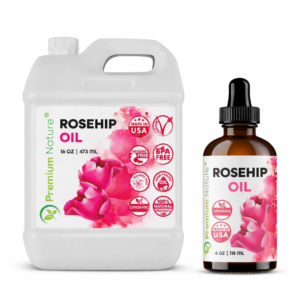 COLD PRESSED ORGANIC QUALITY: Made from carefully selected rosehip seeds using a cold-press extraction process to maintain the oil's natural characteristics. PREMIUM NATURE STANDARDS: Produced in the USA and crafted to meet high quality standards. Free from hexane and sulfates packaged in BPA-free containers. TWO PRACTICAL SIZES: The 16 oz bottle is ideal for regular use and refills, while the 4 oz bottle is convenient for daily routines or travel. MULTI-USE CARRIER OIL: Suitable for a variety of cosmetic and personal care applications including skin care routines, hair care, massage blends, and DIY beauty formulations. COMPLETE ROSEHIP OIL BUNDLE: Includes 1 × Rosehip Oil 16 oz (473 ml) and 1 × Rosehip Oil 4 oz (118 ml) - two convenient sizes for everyday use and refilling smaller containers.