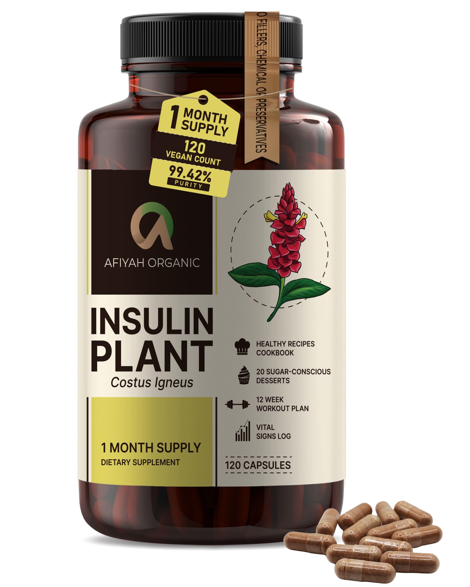 Premium Quality Costus Igneus (Insulin Plant) Capsules - Easy to Swallow 120 Veggie Capsules (1 Month Supply) - Made in The USA - Including Complete Health Support Program 120 Count (Pack of 1)