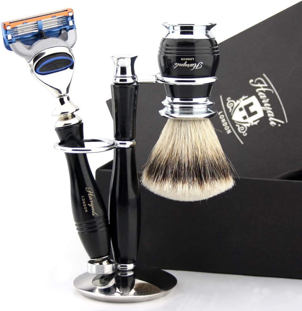 Characteristics: 1 x Gillette Fusion razor 1 x razor brush 1 x shaving stand Silver pointed badger shaving brushes The finest natural hair for handmade shaving brushes Its special features are the shimmering silver color and a black band that runs through the hair. The brushes are incredibly fine and flexible and make them smooth on the skin With the ability to keep a large amount of water, sapping is quick and easy. Handmade in Great Britain: The shaving brushes are handmade by Haryali London in Great Britain ? height: 10 cm ? hair length: 5cm ? handle height: 5cm ? hair class: silver-top dach ? grip material: resin Gillette fusion compatible razor If it is a close, but very comfortable shave you are looking for, don't look any further This razor uses easily available Gillette Fusion Blades that are free and smooth on the face This Gillette Fusion compatible razor was developed to offer optimal balance while it is comfortable in his hand. Extraordinary for wet shaving ? Material: Harz ? Cartridge: Gillette Fusion (pre -installed and interchangeable) ? Length: 15cm ? Weight: 75g ? Color: black Double stand more than just a stylish accessory, these stand offers you the best way to store your RASI tools, Keep the bush in the best dry position to ensure that the bristles get the best treatment This stand is also suitable for many other brushes and razor devices, suitable for most models ? Inner diameter brush holder: 3cm ? Inner diameter razor holder: 3cm ? Height: 13cm ? Weight: 261g Comes in Haryali London Designer Box Top quality from Haryali London secured handmade in Great Britain.Made with high -quality materials.Double stand for razors and brushes.It enables your brush and razor to dry properly between the applications, while they are kept away from bacteria.Excellent grip, perfect balance and performance in our top selling Gillette Fusion compatible razor.Designed, created and branded by Haryali London, a guarantee of authenticity.Silberspitzen -Dachs hairbrush - the best kind of hair!Handmade and carefully selected.Incredibly soft and flexible for a gentle and gentle experience.The perfect water intake guarantees a quick and simple foam. Eigenschaften: 1 x Gillette Fusion Rasierer 1 x Rasierpinsel 1 x Rasierstand Silber Spitze Dachs Rasierpinsel Das feinste Naturhaar für handgefertigte Rasierpinsel Seine besonderen Merkmale sind die schimmernde silberne Farbe und ein schwarzes Band, das durch die Haare läuft. Die Pinsel sind unglaublich fein und flexibel und machen sie auf der Haut glatt Mit der Fähigkeit, eine große Menge Wasser zu halten, ist das Einseifen schnell und einfach. In Großbritannien handgefertigt: Die Rasierpinsel werden von Haryali London in Großbritannien handgefertigt ? Höhe: 10 cm ? Haarlänge: 5cm ? Griffhöhe: 5cm ? Haarklasse: Silberspitzen-Dachs ? Griffmaterial: Harz GILLETTE FUSION KOMPATIBLER RASIERER Wenn es eine nahe, aber sehr komfortable Rasur ist, die Sie suchen, suchen Sie nicht weiter Dieser Rasierer verwendet leicht verfügbare Gillette Fusion Klingen, die frei und glatt auf dem Gesicht sind Dieser Gillette Fusion kompatible Rasierer wurde entwickelt, um optimale Balance zu bieten, während er bequem in der Hand liegt. Außergewöhnlich für Nassrasur ?Material: Harz ?Cartridge: Gillette Fusion (vorinstalliert und austauschbar) ?Länge:15cm ?Gewicht: 75g ?Farbe: schwarz Doppelständer Mehr als nur ein stilvolles Accessoire, dieser Ständer bietet Ihnen die beste Möglichkeit Ihre Rasi-erwerkzeuge zu verstauen, Halten Sie den Busch in der besten Trockenposition, um sicherzustellen, dass die Borsten die beste Behandlung erhalten Dieser Ständer eignet sich auch für viele andere Bürsten und Rasierapparate, passend für die meisten Modelle ?Innendurchmesser-Bürstenhalter: 3cm ?Innendurchmesser-Rasierer Halter: 3cm ?Höhe: 13cm ?Gewicht: 261g Kommt in Haryali London Designer Box Top-Qualität von Haryali London gesichertHandgemacht in Großbritannien. Hergestellt mit hochwertigen Materialien. Doppelständer Für Rasierer und Pinsel. Es ermöglicht Ihrem Pinsel und Rasierer zwischen den Anwendungen richtig zu trocknen, während sie von Bakterien ferngehalten werden. Hervorragender Grip, perfekte Balance und Leistung in unserem Top Selling Gillette Fusion kompatiblen Razor. Entworfen, kreiert und gebrandmarkt von HARYALI LONDON, ein Garant für Authentizität. Silberspitzen-Dachs Haarbürste - Die beste Art von Haar! Handgefertigt und sorgfältig ausgewählt. Unglaublich weich und flexibel für ein sanftes und sanftes Erlebnis. Die perfekte Wasseraufnahme garantiert einen schnellen und einfachen Schaum.Premium Silberspitze Dachsrasierpinsel und 5 edgeskartusche kompatible Rasiermesser im Luxusgriff - Nassrasierset für Ihn