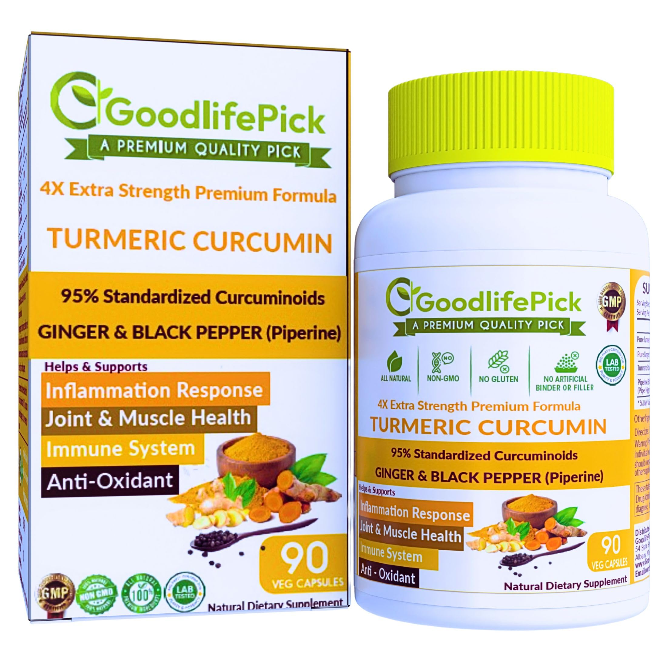 SUPPORTS METABOLISM - Turmeric supplement with Ginger is an excellent choice to help and Support Metabolism. The 95 Curcuminoids adds Extra Strength to the Formula. MANUFACTURED IN FDA REGISTERED INSPECTED FACILITY, GMP CERTIFIED, LAB-TESED. Made with Premium Quality Ingredients. - This product is made with premium quality ingredients in a FDA Registered and Inspected facility, GMP certified, and lab-tested. It contains 95 Curcuminoids and Organic Turmeric powder with Black Pepper and Organic Ginger Root to promote Overall Health and Well-Being. Made with Premium High Quality Ingredients which come from their real origin and native land. ALL-NATUAL, NON-GMO, NO-GLUTEN, NO-ADDITIVES, NO-ARTIFICIAL FLAVORS, NO BINDER, NO-FILLER, ALLERGEN FREE, NO-SOY, NO-DAILRY CRUELITY-FREE - This Turmeric and ginger supplement is Allergen Free with additional benefit added thru 95 Standardized Curcuminoids. PREMIUM TURMERIC CURCUMIN(Curcuma Longa) WITH 95 CURCUMIONOIDS ADDED POWER OF GINGER (Zingiber officinalle) PIPERINE (Black Pepper Piper Nigrum) to Supports Joint Muscle Health and Immune System. GOLDEN HERB 4X FORMULA WITH OPTIMIZED POTENCY OF 1500 MG FOR SUPERIOR ABSORPTION - This Tumeric Curcumin supplement with black pepper is a 4X Golden Herb Formula with optimized potency of 1500 mg for superior absorption. The 95 Curcuminoids concentration provides Extra Strength.