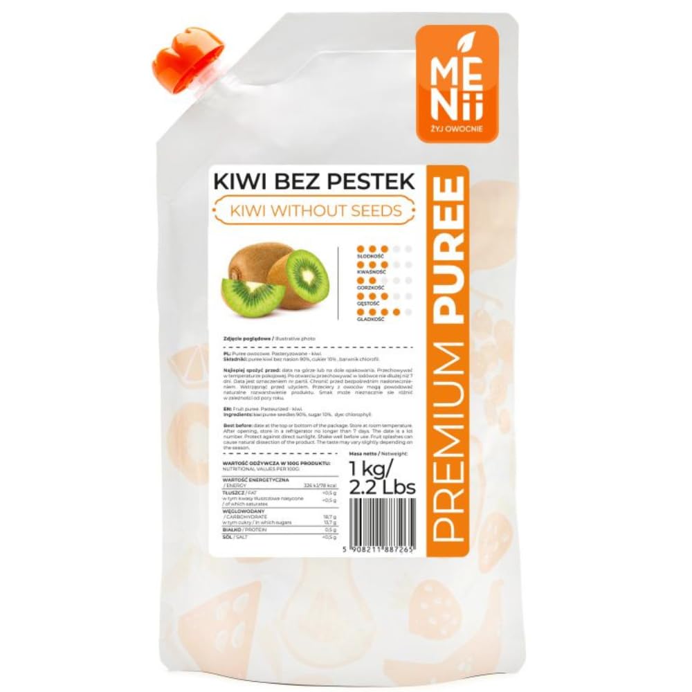 Ingredients: Kiwi puree 90 , sugar 10 , color: chlorophyll. Nutritional Information: Per 100g: Energy: 352 kJ 84 kcal Fat: 0.7 g, of which saturates: 0.5 g Carbohydrate: 18.8 g of which sugars: 16.2 g Protein: 0.6 g Salt: 0.5 g. Net weight: 1 kg
