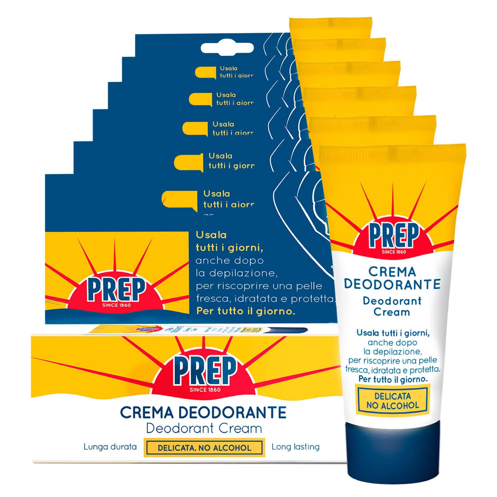 Contains no alcohol, parabens, dyes, or preservatives. Won't stain fabrics or leave a greasy residue. Moisturizes and refreshes the skin, leaving a delicate fragrance. Provides 48-hour protection. Ideal for everyday use, even after hair removal. Deodorant suitable for all skin types with an antiperspirant formula. The kit contains: 6 x 35ml bottles of Prep deodorant cream.