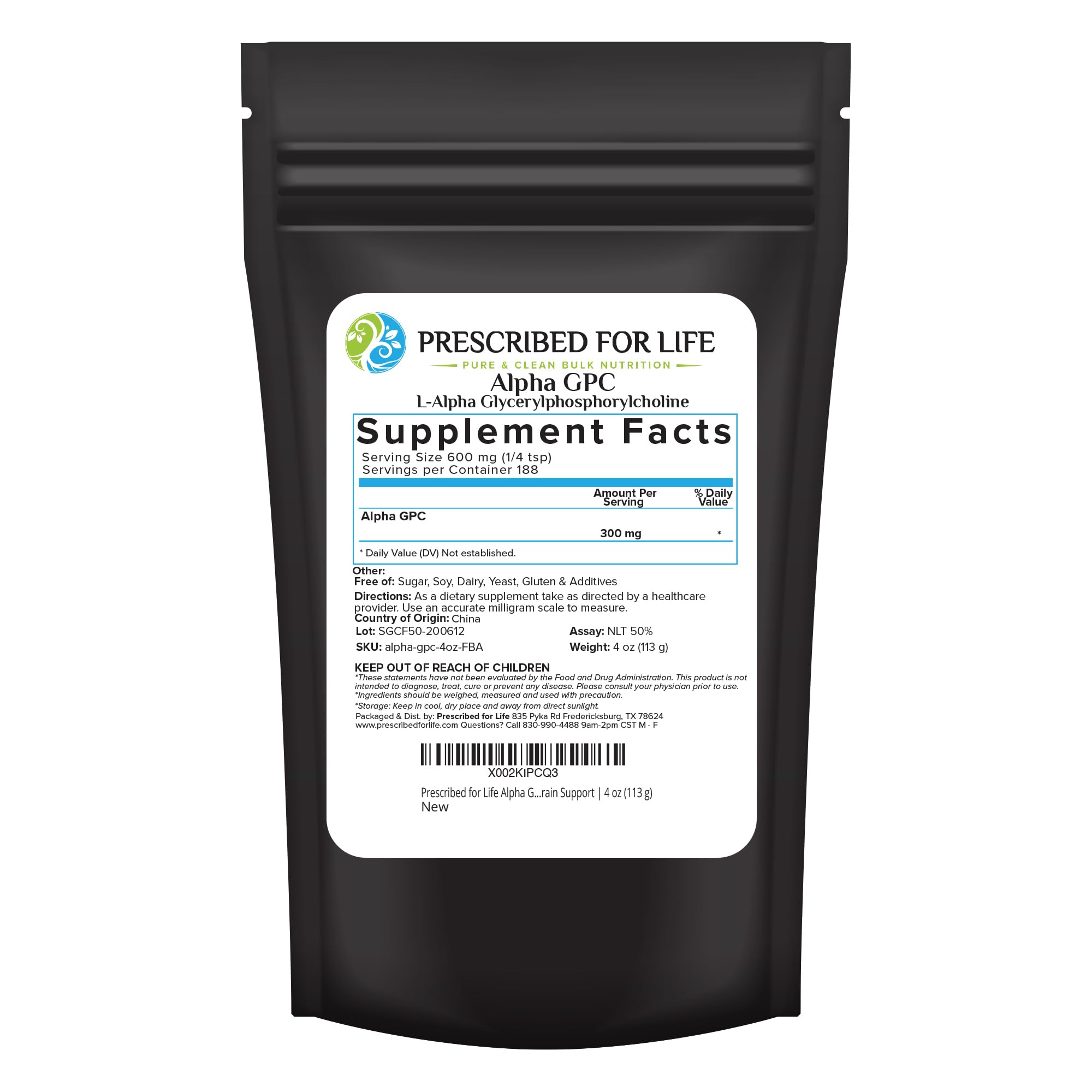 PREMIUM BULK NUTRITION: Prescribed for Life offer sizes from 56 g to 25 kg (55 lbs) for all your bulk memory supplement needs. Our Alpha GPC choline powder is packaged in the USA in accordance with GMP guidelines. CONVENIENT RESEALABLE POUCH: Prescribed for Life choline supplements come in a durable, resealable pouch. It's easy to store and keeps your Alpha GPC choline fresh for a maximum long shelf life. PERFECT FOR YOUR HEALTHY DIET: Our Alpha GPC brain supplement is gluten free, vegan and non GMO. All products are 3rd party lab tested, so you can be sure you're getting a nootropic supplement that is genuine and as pure as possible. SUPPORT MEMORY FOCUS : Our Alpha GPC choline supplement acts as a precursor to acetylcholine. Acetylcholine plays an important role in brain functions. PURE NATURAL: Prescribed for Life Alpha GPC choline powder contains 50 Alpha GPC with 48 starch and 2 silicon dioxide to prevent clumping.