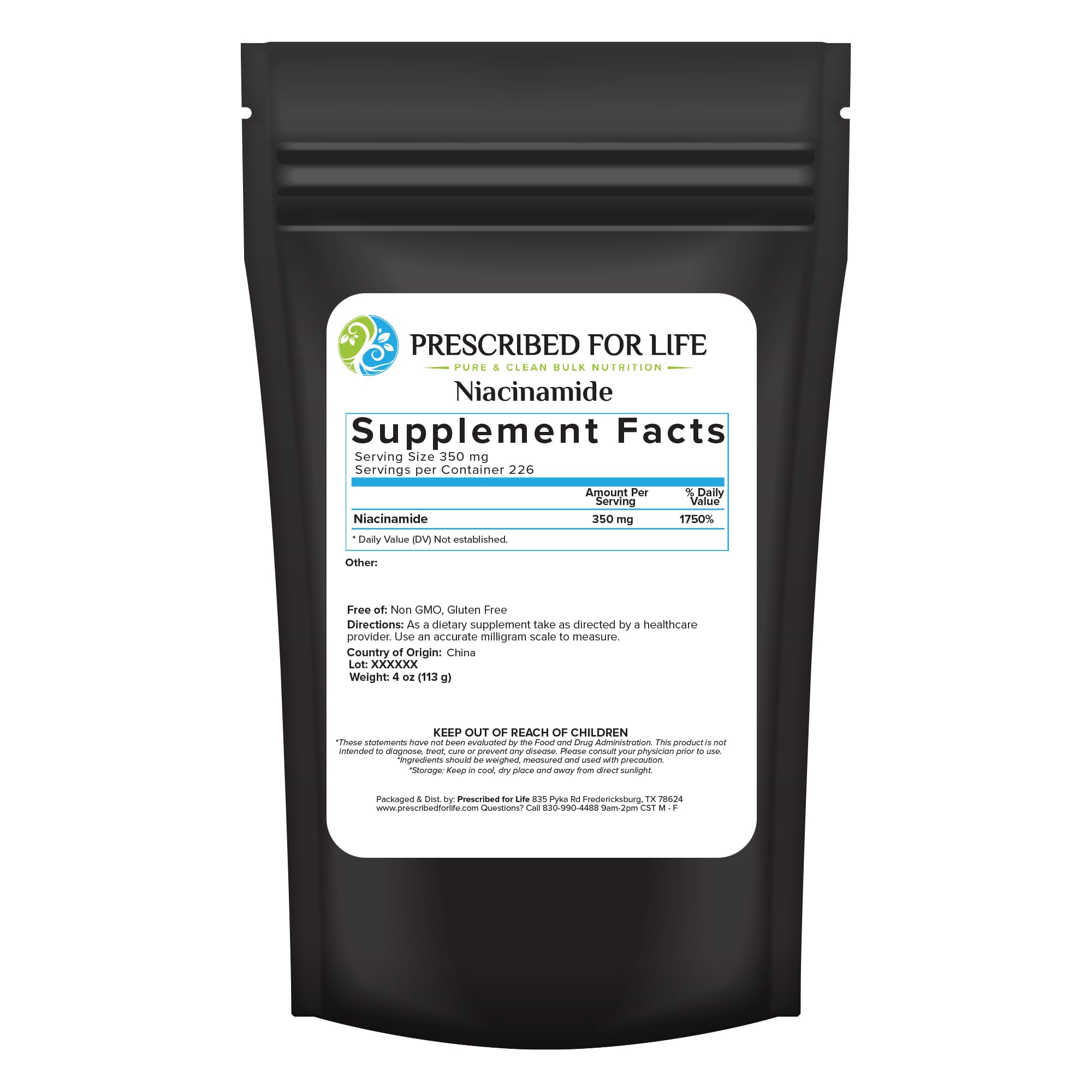 PREMIUM BULK NUTRITION: Prescribed for Life offer sizes from 113 g to 25 kg (55 lbs) for your niacinamide powder bulk needs. Our niacinamide supplement powder is packaged in the USA in accordance with GMP guidelines. CONVENIENT RESEALABLE POUCH: Prescribed for Life vitamin b powder comes in a durable, resealable pouch. It's easy to store and keeps your niacinamide supplements fresh for maximum long shelf life. PERFECT FOR YOUR HEALTHY DIET: Our vitamin b3 niacinamide powder is gluten free, kosher, vegan, and non GMO. At Prescribed for Life, we 3rd party lab test all our products to make sure you receive a nicotinamide supplement that's genuine and as pure as possible. SUPPORTS HEALTHY SKIN : Nicotinamide, also known as niacinamide, is a water-soluble form of vitamin B3. Clinical studies suggest that using niacinamide powder for skin care may increase hydration and improve skin texture. PURE NATURAL: Prescribed for Life Niacinamide Powder is a pure, single ingredient, niacinamide powder supplement. It contains no additives, preservatives, fillers, or binders of any kind.