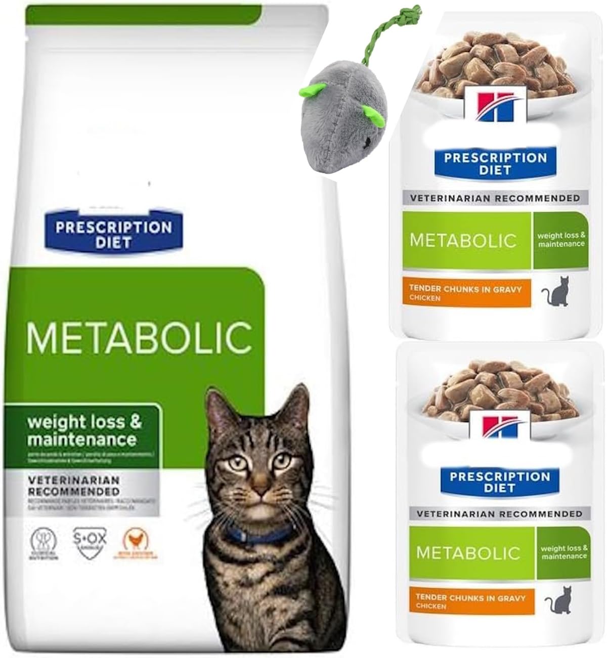 fiber, ensuring your cat's Prescription Diet Feline Metabolic Wet Pouch for Cats Prescription Diet Feline Metabolic Wet Pouch offers a convenient and effective solution for weight management in cats. These easy-to-serve pouches provide hassle-free feeding and precise portion control, making it simple to stick to your cat's diet plan. The delicious taste of the wet food is highly appealing to cats, encouraging them to stay on track with their weight loss regimen. Developed based on scientific research and veterinarian recommendations, this wet food also helps increase your cat's water intake, promoting urinary health. When combined with the dry food, the INDICATIONS Weight Managment INGREDIENTS Chicken (27%), pork, cellulose, dried egg white, maize starch, various sugars, dried tomato pomace, wheat meal, minerals, pea protein, coconut oil, linseed oil, dried carrots, vitamins, maize dextrin, dried pork protein, fish oil, trace elements, taurine, beta-carotene. Coloured with natural caramel. DIRECTIONS once a day See more Weight Management: Complements the dry food to offer a balanced approach to weight control. Flavorful and Appealing: Tasty recipe that cats love, helping them stay on their diet plan. Vet-Approved: Developed based on scientific research and veterinarian recommendations. ? Convenient Pouch: Easy-to-serve pouches for quick and accurate portion control. Hydration Benefit: Wet food helps increase water intake, promoting overall urinary health. ✓ Nutritionally Complete: Delivers all essential nutrients, including high-quality protein and. Satiety Blend: Unique mix of ingredients designed to keep your cat feeling full and satisfied. ? Metabolic Boost: Supports a healthy metabolism to aid effective weight management. Specialized Formula: Crafted to support cats in achieving and maintaining a healthy weight. Clinically Tested: Demonstrated to reduce body weight by 11% in just 60 days.
