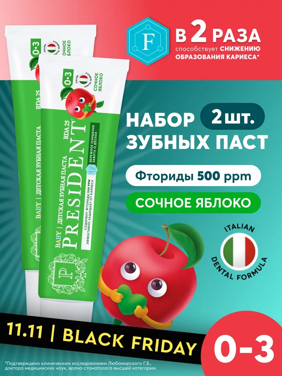 President Зубная паста детская 0-3 Сочное яблоко 2шт