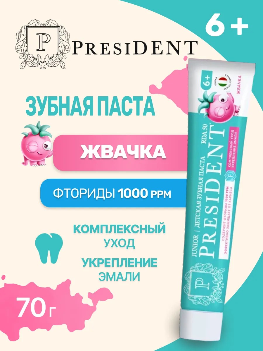 Детская зубная паста PRESIDENT Жвачка 6+ обеспечивает защиту от кариеса, заботу о деснах, укрепление эмали и эффективное очищение.