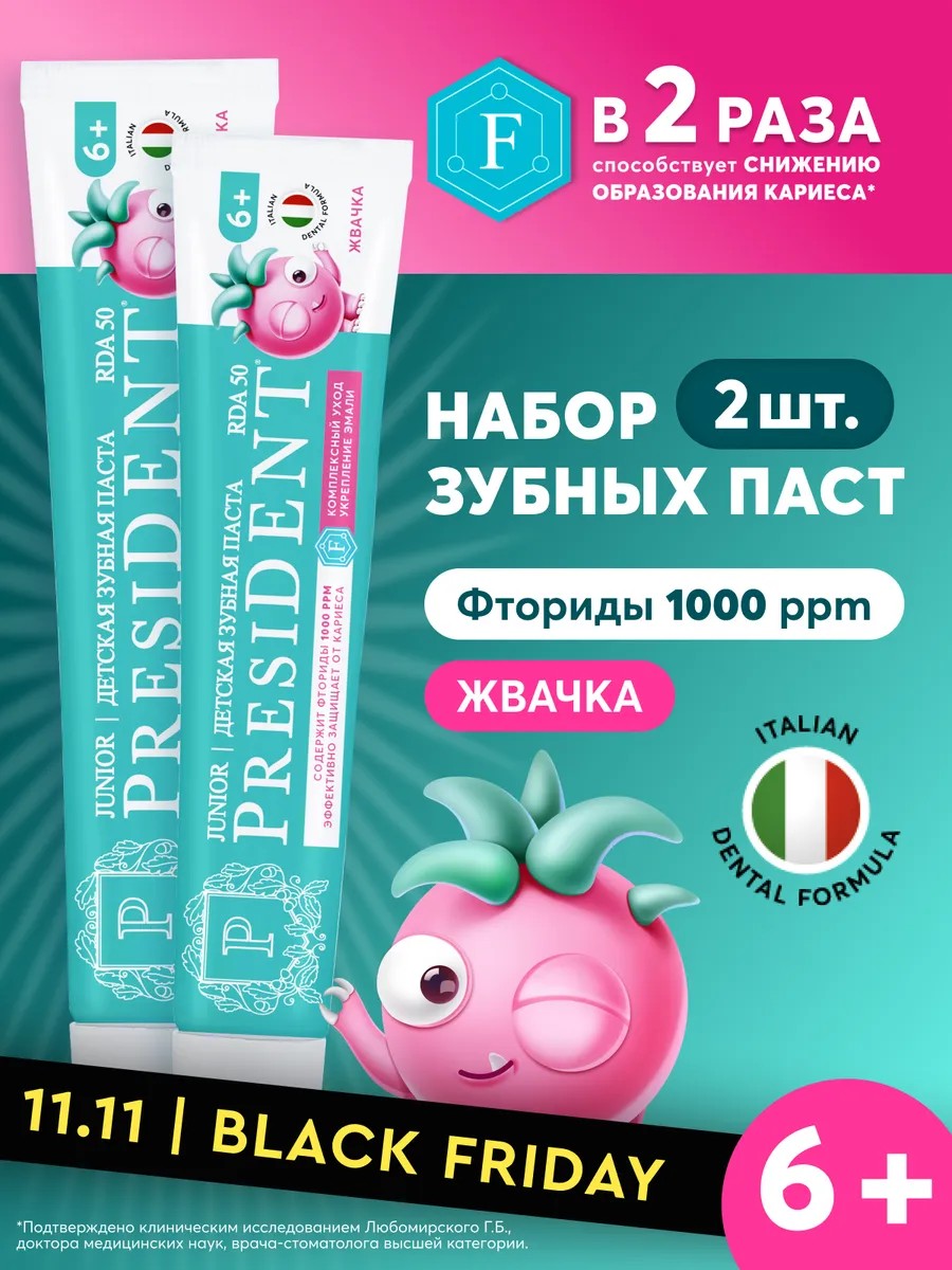 Детская зубная паста PRESIDENT Жвачка 6+ обеспечивает заботу о деснах, укрепление эмали и эффективное очищение. Безопасно при проглатывании! Гелевая форма зубной пасты облегчает очищение в труднодоступных местах. Эффективность клинически доказана. Одобрено детскими стоматологами. 98% натуральный состав. Биодоступный кальций способствует интенсивной реминерализации, укрепляя эмаль молочных и постоянных зубов. Шалфей снижает риск воспаления. Ксилитол подавляет рост бактерий и сокращает образование зубного налета. Фториды - 1000 PPM. НЕ СОДЕРЖИТ: агрессивных абразивов, SLS, SLES, сахара. Применение: после каждого приема пищи, не менее двух раз в день. RDA - контролируемый показатель абразивности зубной пасты. Каждое средство President - это настоящее произведение искусства в сфере заботы о здоровье каждого человека. Если есть возможность выбрать что-то натуральное, то обязательно это стоит делать. Зубная паста подходит для брекетов, она не вызывает аллергии, дискомфорта и других неприятных последствий использования. Огромное количество людей по всему миру отдают предпочтение именно зубной пасте Президент, как универсальному средству, которое позволяет решить несколько проблем - это борьба с кариесом, налетом, чувствительностью десен и все это решается за пару применений. Самое главное, что зубная паста надежная, она прошла все возможные тесты и испытания, прежде чем попасть на прилавки магазинов. Средства гигиены полости рта нашего бренда - это отличный подарок на на День рождения, юбилей и абсолютнос любой другой без исключения праздник, даже без какого-то особого повода, в знак внимания, любви и заботы. У нас есть акции и распродажи, Вы можете купить наши товары в подарок со скидкой.