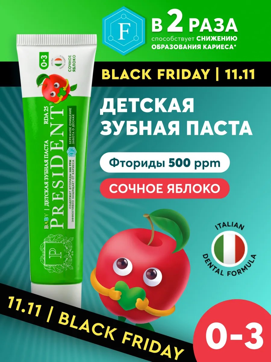 Детская зубная паста PRESIDENT Сочное яблоко от 0 до 3 лет обеспечивает защиту от кариеса, заботу о деснах, укрепление эмали и бережное очищение.