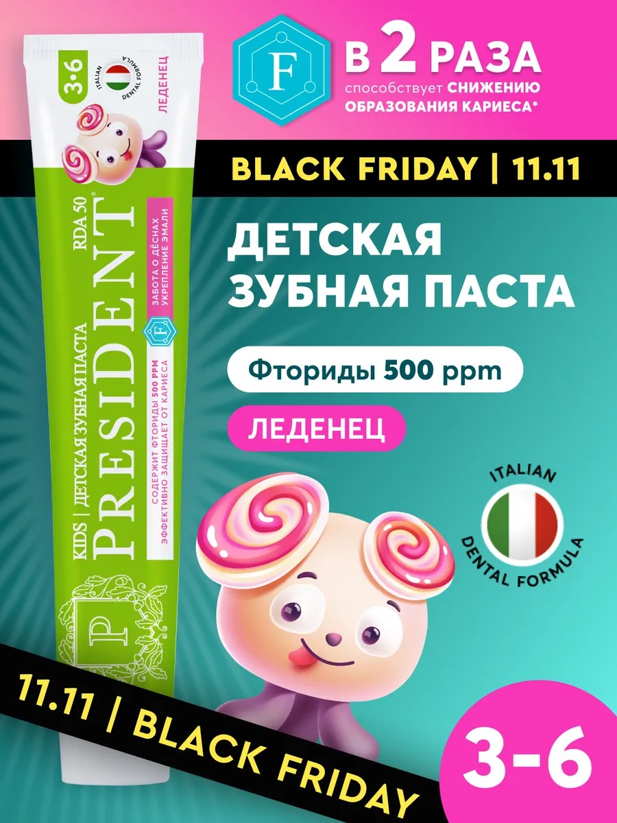 Детская зубная паста PRESIDENT Леденец от 3 до 6 лет обеспечивает защиту от кариеса, заботу о деснах, укрепление эмали и эффективное очищение.
