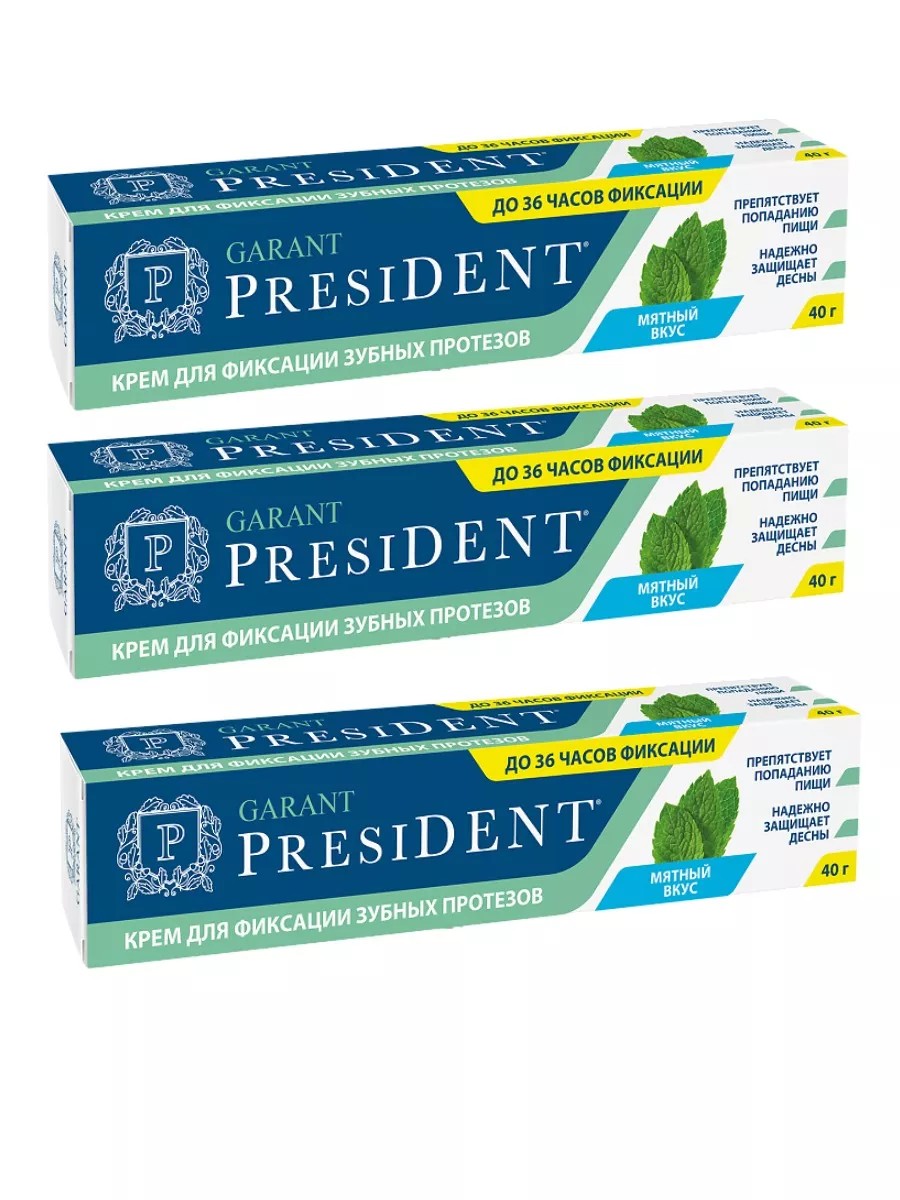 Комплектация3 упаковки; крем для сильной фиксации зубных протезов Президент Гарант