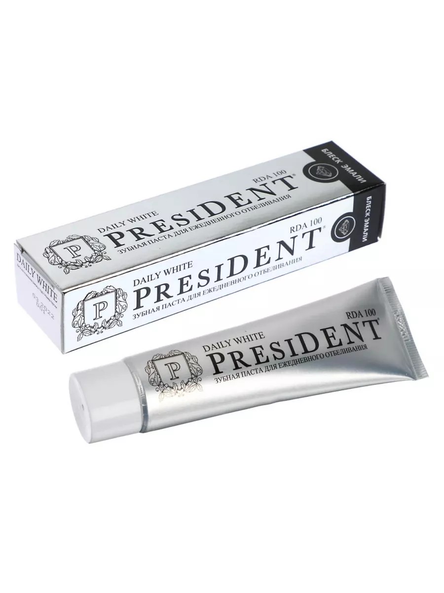 PRESIDENT Зубная паста Daily White, 68 г 1 шт. Инновационные разработки и богатый опыт ведущих итальянских и российских специалистов PRESIDENT воплотились в комплексном подходе к гигиене полости рта и системе контролируемой абразивности зубных паст (RDA). Показатель абразивности RDA это строгий контроль за размером и концентрацией абразивных частиц. Именно показатель RDA помогает выбрать подходящую зубную пасту, которая справится со своей задачей и позволит избежать нежелательных эффектов, таких как возникновение повышенной чувствительности зубов, пожелтение эмали от употребления окрашивающей пищи или курения, а также скапливание бактериального налёта. Специально подобранные абразивы БЕЗОПАСНО и ЭФФЕКТИВНО удаляют налёт, ОЧИЩАЮТ и ПОЛИРУЮТ зубную эмаль. Для чувствительных зубов подходят зубные пасты с RDA 20-25 единиц. Для детей и деликатного очищения подойдут зубные пасты с RDA 25-50 единиц. Для ежедневного очищения показатель RDA должен быть около 70-80 единиц. Отбеливающие зубные пасты с RDA от 80 до 100 единиц позволяют осветлить зубы примерно на 1 тон при регулярном применении в течение 2-х месяцев. Для интенсивного отбеливания подходят зубные пасты с RDA от 120 до 200 единиц, которые могут осветлить зубы уже до 2 тонов. Причем, пасты с RDA 120 желательно применять длительностью в 1 месяц, а с RDA 200 с регулярностью 1 раз в неделю.