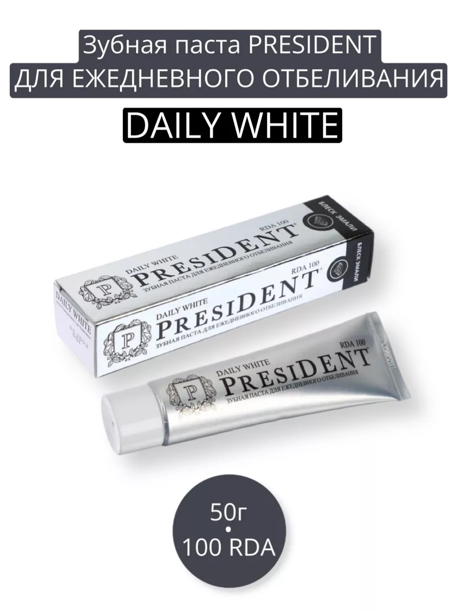 Зубная паста PRESIDENT Daily White RDA 100 для ежедневного отбеливания представляет собой не просто средство для ежедневного гигиенического ухода, но и настоящего союзника в поддержании вашего здоровья. Представьте себе, что каждое ее применение – это не только процедура по уходу за зубами, но и нежное внимание к вашей эмали.