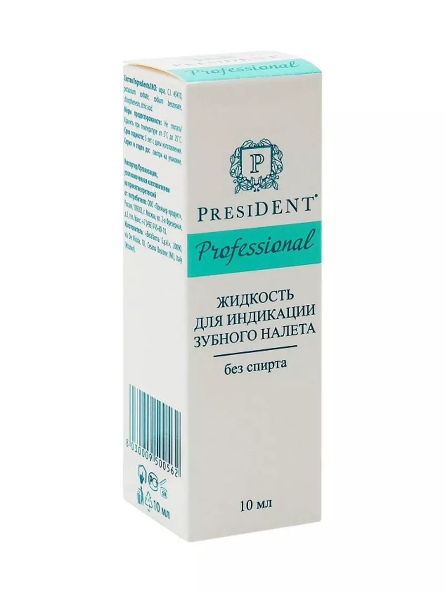 PRESIDENT Plaque Indicator Liquid. For assessing the effectiveness of oral hygiene. For teaching daily oral hygiene. For identifying plaque and hard deposits in hard-to-clean areas. Recommended for both professional use in dentistry and for home use. Plaque indicator liquid (alcohol-free). Directions for home use: After brushing your teeth, apply 3-5 drops of liquid to the tongue and distribute evenly over the surface of the teeth for 30 seconds without swallowing. Rinse your mouth with water. Bacterial plaque will be stained. Directions for professional use: Indicated on the package insert. Precautions: Do not swallow!