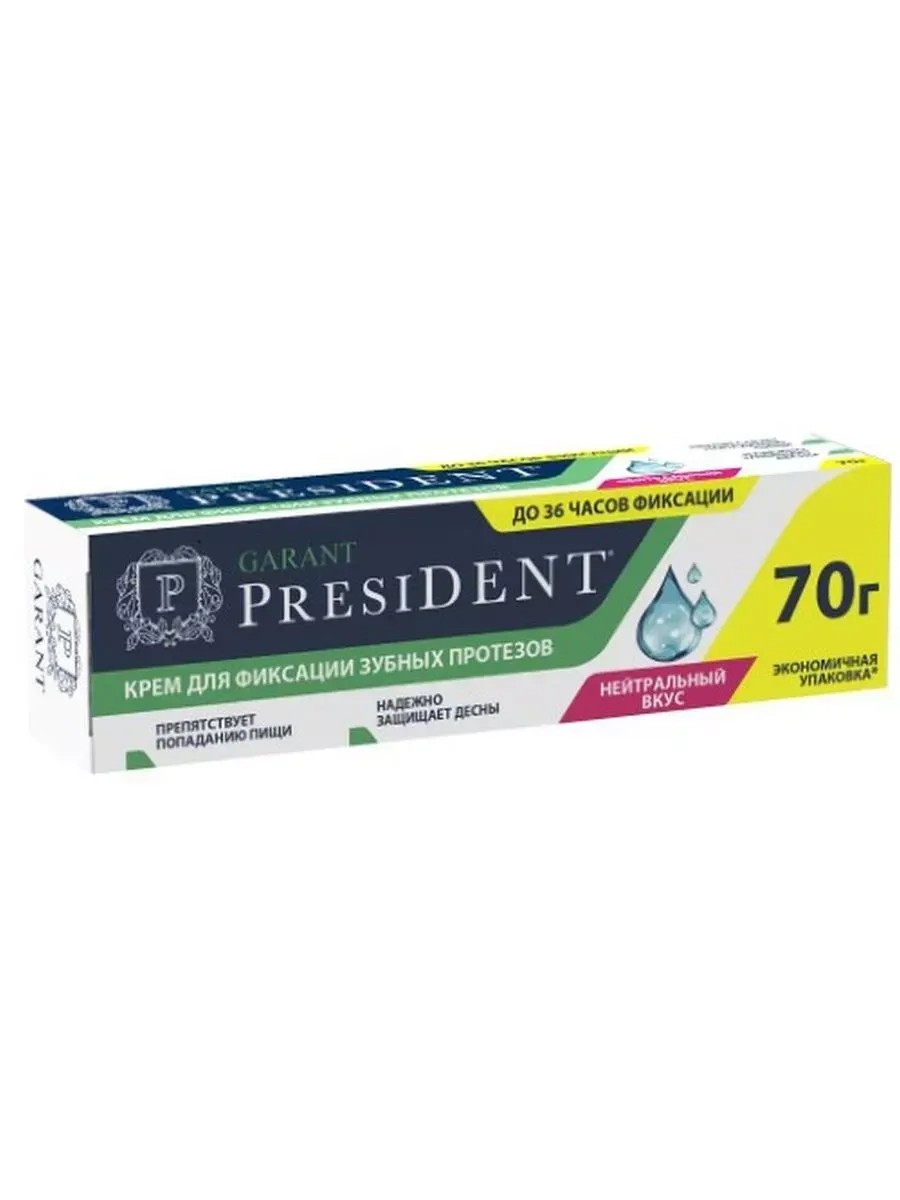 Бренд PresiDENTЛиния Forever Young - УХОД ЗА ПРОТЕЗАМИ - Специализированные средства по уходу за полостью рта для съемных и частично съемных протезов. Для тех, кто любит активно жить и улыбаться.ПРЕЗИДЕНТ КРЕМ ГАРАНТ ДЛЯ ФИКСАЦИИ ЗУБНЫХ ПРОТЕЗОВ / НЕЙТРАЛЬНЫЙ ВКУС - экстрасильная фиксация до 36 часовВнешний вид и свойства: Кремообразная консистенция, цвет розовый, без вкуса и запаха.Специальный крем обеспечивает надежную защиту десен при ношении зубных протезов.Заполняет зазоры между челюстью и протезом мягкой упругой прослойкой.Защищает пространство под протезами от попадания частиц пищи.Экономичен в применении.Активные компоненты:Содержит натуральные антибактериальные компоненты: экстракты ромашки и липы, которые помогают снизить риск воспаления десенНатриево-кальциевые соли (магнитный полимер) дают длительную фиксациюРезультат:Препятствует попаданию пищи,Надежно защищает десныСоответствует требованиям Всемирной Организации Здравоохранения (ВОЗ) и возрастным нормам.