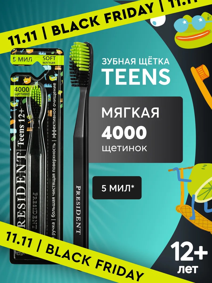 Зубная щетка PRESIDENT TEENS 12+, отличный выбор для подростков от 12 лет, кто заботится о своей улыбке и здоровье зубов. Эта щетка делает чистку зубов более комфортной и эффективной благодаря своим особенностям. Обеспечивает эффективное очищение зубов и десен благодаря увеличенному количеству щетинок - 4000 штук. Щетинки с ионами серебра обеспечивают антибактериальный эффект. А еще она идеально подходит для ухода за брекетами и ортодонтическими конструкциями. Идеально закругленные и отполированные щетинки не травмируют десны. В составе нет Бисфенола А. Кроме того, важно правильно использовать зубную щетку для достижения максимального эффекта. Рекомендуется чистить зубы два раза в день, утром и вечером, примерно по 2-3 минуты каждый раз. Не забывайте о здоровом питании и умеренном потреблении сладкого и кислого. А еще не забудьте промыть зубную щетку перед и после использования. Средства гигиены полости рта нашего бренда - это отличный подарок на на День рождения, юбилей и абсолютно любой другой без исключения праздник, даже без какого-то особого повода, в знак внимания, любви и заботы. У нас есть акции и распродажи, Вы можете купить наши товары в подарок со скидкой.