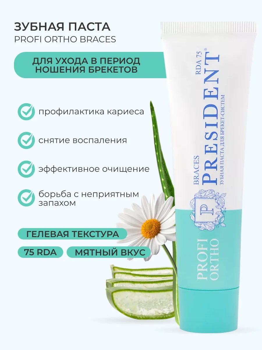 Зубная паста PRESIDENT PROFI ORTHO Braces с RDA 75 специально разработана для качественного ухода за полостью рта и профилактики кариеса, отложений зубного камня, воспалений и неприятного запаха изо рта - проблем, которые наиболее часто возникают в период использования брекет-систем и других ортодонтических конструкций. Активные компоненты: Папаин и Бромелайн расщепляют белковый налет; Корень солодки подавляет рост бактерий; Бисаболол уменьшает воспаление; Сок Алоэ ускоряет заживление. Применение: после каждого приема пищи, не менее двух раз в день. RDA - контролируемый показатель абразивности зубной пасты. Забота о здоровье всегда начинается с гигиены полости рта. Потому что только при здоровых зубах можно гарантировать здоровье всего организма. Как этого добиться? Использовать качественные средства ухода, которые дадут хороший результат. Именно поэтому, наша зубная паста для чувствительных зубов так популярна среди ценителей действительно достойных товаров. Каждое средство President - это настоящее произведение искусства в сфере заботы о здоровье каждого человека. Если есть возможность выбрать что-то натуральное, то обязательно это стоит делать. Зубная паста не вызывает аллергии, дискомфорта и других неприятных последствий использования. Поэтому, обязательно стоит использовать эту пасту, как настоящий профессиональный уход и постараться, чтобы Ваши близкие тоже воспользовались таким привлекательным решением.Подбор хорошей пасты поможет решить множество проблем с ежедневной заботой и уходом. А мы поможем Вам приобрести столь достойный и необходимый товар по привлекательным ценам. Ведь мы всегда устраиваем акции и дополнительные скидки для выгодных приобретений. Поспешите себя побаловать профессиональной пастой, которая никого не оставит равнодушным!