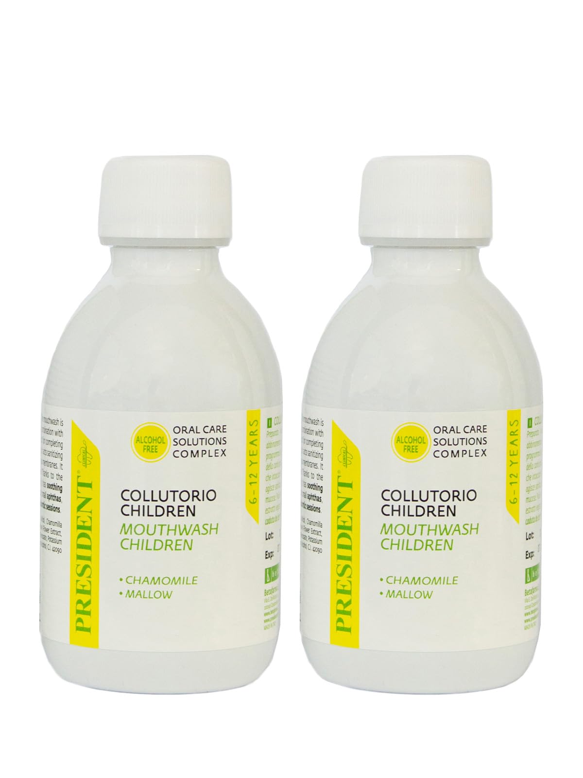 Preventive anti-cavity treatment, used in conjunction with toothpastes from the "President Children" line to complement children's daily oral hygiene routine. The main causes of cavities are bacterial plaque and acids, derived from food residue, which affect teeth. This mouthwash strengthens and protects the enamel and disinfects the oral cavity while being completely gentle on the gums and mucous membranes. It can also be used for its soothing properties (thanks to plant extracts of chamomile and mallow), in cases of minor aches or after the loss of baby teeth or after uncomfortable orthodontic treatments. INGREDIENTS Aqua (Water), Propanediol, Xylitol, Chamomilla Recutita (Matricaria) Flower Extract, Mauve Sylvestris (Mallow) Flower Extract, Poloxamer 407, Sodium Phosphate, Sodium Fluoride, Sodium Benzoate, Potassium Sorbate, Sodium Saccharin, Aroma (Flavor), Limonene, Benzyl Alcohol, CI 44407, CI 2090 (Blue 1), CI 19140 (Yellow 5). Contains sodium fluoride (230 ppm F-). DIRECTIONS Rinse your mouth for approximately 40 seconds with 15 ml of undiluted Children's Mouthwash, using the measuring cap. Warnings: Do not swallow. Keep out of reach of children. SAFETY WARNING Please read the warnings on the kit. See more100 Made in Italy: Designed, formulated, and manufactured at the Betafarma S.p.A. factory in Cesano Boscone (MI). Directions for use: Rinse your mouth for approximately 40 seconds with 15 ml of undiluted Children's Mouthwash, using the measuring cap. Check the PAO (Period After Opening) symbol, which indicates the product's expiration time after opening the packaging. Alcohol-free, it also provides a soothing action thanks to plant extracts of chamomile and mallow, for minor aches and pains, after baby teeth have fallen out, or after uncomfortable orthodontic appointments. Effective: It works deep down, even between teeth, complementing the action of toothpaste and toothbrush, and is particularly suitable for children with braces. COLLUTOUR FOR CHILDREN AGED 6 TO 12 YEARS: effectively strengthens and protects teeth against plaque and cavities and offers superior protection compared to using toothpaste alone.President Kit 2 coulis ChilDREN pour enfants de 6 à 12 ans. Antiplaque, anti-caries, renforce et protège l'émail des dents. Sans alcool. 2 x 200 mlDESCRIPTION DU PRODUIT DESCRIPTION DU PRODUIT Traitement préventif anti-caries, associé aux dentifrices de la ligne « President Children» pour compléter le programme d'hygiène bucco-dentaire quotidien des enfants. Les principales causes de la formation de caries sont la plaque bactérienne et les acides, dérivés des résidus de nourriture, qui affectent les dents. Ce bain de bouche renforce et protège le vernis et agit en désinfectant la cavité buccale dans le respect total des gencives et des muqueuses. Il peut également être utilisé avec une fonction apaisante (grâce aux extraits végétaux de camomille et mauve), en cas de petites aftes ou après la chute des dents de lait ou après les séances gênantes par l'orthodonziste. INGRÉDIENTS Aqua (Water), Propanediol, Xylitol, Chamomilla Recutita (Matricaria) Flower Extract, Mauve Sylvestris (Mallow) Flower Extract, Poloxamer 407, Sodium Phosphate, Sodium Fluoride, Sodium Benzoate, Potassium Sorbate, Sodium Saccharin, Aroma (Flavor), Limonène, Benzyl Alcohol, C.I. 44407. 2090 (Blue 1), C.I. 19140 (Yellow 5). Contient du fluorure de sodium (230 ppm F-). MODE D'EMPLOI Rincer la bouche pendant environ 40 secondes avec 15 ml de bain de bouche Children non dilué, en utilisant le bouchon doseur. Avertissements : ne pas avaler. Tenir hors de portée des enfants. AVERTISSEMENT DE SÉCURITÉ Veuillez lire les avertissements figurant sur la trousse Voir plus100 fabriqué en Italie : conçu, formulé et fabriqué dans l'usine de Betafarma S.p.A à Cesano Boscone (MI). Mode d'utilisation : rincer la bouche pendant environ 40 secondes avec 15 ml de bain de bouche Children non dilué, en utilisant le bouchon doseur. Vérifiez le symbole PAO (Period After Opening) qui indique le temps d'expiration du produit, après l'ouverture de l'emballage. Sans alcool, il diffuse également une action apaisante grâce aux extraits végétaux de camomille et de mauve), en cas de petites aftes ou après la chute des dents de lait ou après les séances gênantes par l'orthodonziste. Efficace : il agit en profondeur, même entre les espaces interdentaires, complétant l'action de dentifrice et de brosse à dents, et est particulièrement indiqué pour les enfants avec appareil orthodontique. COLLUTOUR POUR ENFANTS DE 6 À 12 ANS : renforce et protège efficacement les dents contre la plaque et les caries et offre une protection supérieure par rapport à l'utilisation du dentifrice seul.