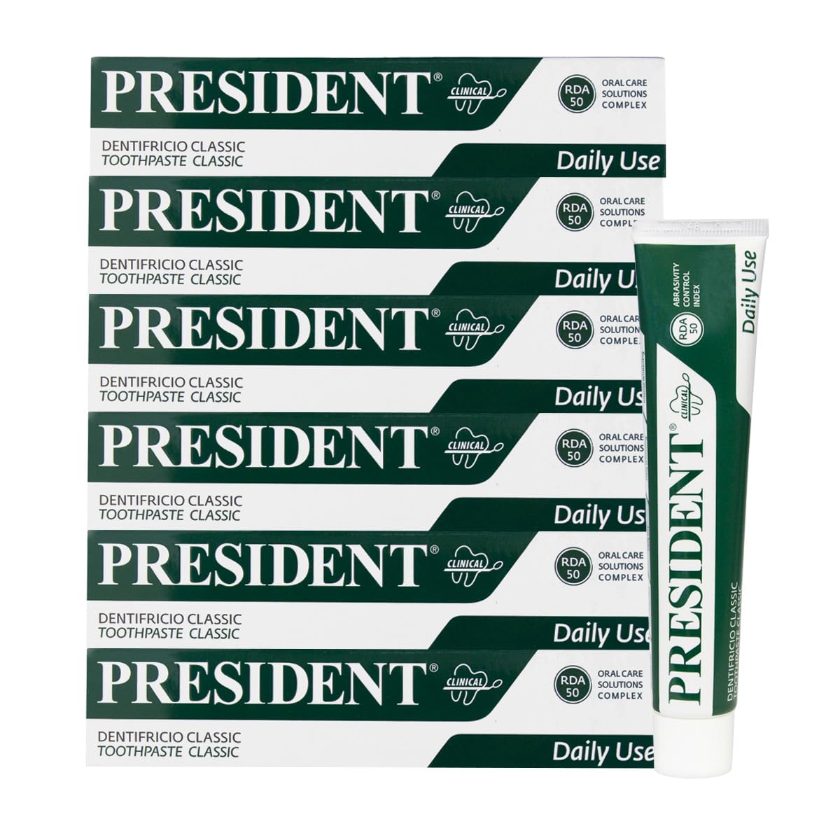 Classic Toothpaste guarantees balanced, calibrated, and safe cleaning power, with an anti-cavity function thanks to an adequate sodium fluoride content, and a refreshing and soothing function thanks to plant extracts of chamomile, sage, and lemon balm. This toothpaste is distinguished by its advanced formulation technology, using special blends of chemically inert, precipitated silicas with innovative physical characteristics that allow it to achieve and guarantee the desired level of abrasiveness. INGREDIENTS Aqua (Water), Xylitol, Hydrated Silica, Sorbitol, Glycerin, Cellulose Gum, Aroma (Flavor), Mentha Piperita (Peppermint) Oil, Sodium Myristoyl Sarcosinate, Sodium Cocoyl Glutamate, Sodium Saccharin, Sodium Fluoride, Propylene Glycol, Sauge Officinalis (Sage) Extract, Chamomilla (Chamomile) Matricaria Flower Extract, Melissa Officinalis Flower Leaf Stem Water, Eugenol, Geraniol, Sodium Benzoate, Titanium Dioxide (CI 77891), CI 42090 (Blue 1), CI 19140 (Yellow 5). Contains sodium fluoride (950 ppm F). The ingredient list is subject to change always refer to the product label. SAFETY WARNING For external use only. Do not swallow. Keep out of reach of children. If irritation occurs, discontinue use and consult a dentist. See more100 Made in Italy: Designed, formulated, and manufactured at the Betafarma S.p.A. factory in Cesano Boscone (MI). Directions for use: Apply a small amount of toothpaste to a toothbrush. It is recommended to use the product at least twice a day, brushing for at least two minutes. Properties: This toothpaste is distinguished by its advanced formulation technology, thanks to the use of special blends of chemically inert, precipitated silicas with innovative physical characteristics that allow for and guarantee the desired level of abrasiveness. Intended for use: Classic toothpaste is suitable for all ages and is excellent for daily use. Classic toothpaste: Classic toothpaste guarantees balanced, calibrated, and safe cleaning power, with an anti-cavity function thanks to an adequate sodium fluoride content, and a refreshing and soothing function thanks to plant extracts of chamomile, sage, and lemon balm.President KIT 6 DENTIFRICE CLASSIC pour usage quotidien. Action anti plaque, anti carie, refraisante, antihalitose. Avec extraits végétaux de mélisse, sauge, camomille. RDA 50. 6 x 75 mlDESCRIPTION DU PRODUIT DESCRIPTION DU PRODUIT Le Dentifrice Classic garantit un pouvoir nettoyant équilibré, calibré et sûr, avec fonction anticarie, grâce à une teneur adéquate en sodium fluorure, et avec fonction rafraîchissante et apaisante, grâce aux extraits végétaux de camomille, sauge et mélisse. Ce dentifrice se distingue par une technologie de formulation avancée grâce à l'utilisation de mélanges particuliers de silices précipités, chimiquement inertes, avec des caractéristiques physiques innovantes qui permettent d'obtenir et de garantir le degré d'abrasivité souhaité. INGRÉDIENTS Aqua (Water), Xylitol, Hydrated Silica, Sorbitol, Glycerin, Cellulose Gum, Aroma (Flavor), Mentha Piperita (Peppermint) Oil, Sodium Myristoyl Sarcosinate, Sodium Cocoyl Glutamate, Sodium Saccharin, Sodium Fluoride, Propylene Glycol, Sauge Officinalis (Sage) Extract, Chamomamomalis. illa Recutita (Matricaria) Flower Extract, Melissa Officinalis Flower Leaf Stem Water, Eugenol, Géraniol, Sodium benzoate, Titanium Dioxyde (C.I. 77891), C.I. 42090 (Blue 1), C.I. 19140 (Yellow 5). Contient du fluorure de sodium (950 ppmF ). La liste des ingrédients peut subir des changements, veuillez toujours vous référer à celle figurant sur le produit. AVERTISSEMENT DE SÉCURITÉ Pour usage extérieur. Ne pas avaler, tenir hors de portée des enfants, arrêter l'utilisation et consulter un dentiste en cas d'irritation. Voir plusProduit 100 fabriqué en Italie : conçu, formulé et fabriqué dans l'usine de Betafarma S.p.A à Cesano Boscone (MI). Mode d'utilisation : appliquer une petite quantité de dentifrice sur une brosse à dents. Il est recommandé d'utiliser le produit au moins deux fois par jour, en brossant les dents pendant au moins deux minutes. Propriétés : ce dentifrice se distingue par une technologie de formulation avancée grâce à l'utilisation de mélanges particuliers de silices précipités, chimiquement inertes, avec des caractéristiques physiques innovantes qui permettent d'obtenir et de garantir le degré d'abrasivité souhaité. À ceux qui sont indiqués : le dentifrice Classic est adapté à tous les âges et est excellent pour un usage quotidien. Dentifrice Classic : le dentifrice Classic garantit un pouvoir nettoyant équilibré, calibré et sûr, avec fonction anticarie, grâce à une teneur adéquate en sodium fluorure, et avec fonction rafraîchissante et apaisante, grâce aux extraits végétaux de camomille, sauge et mélisse.