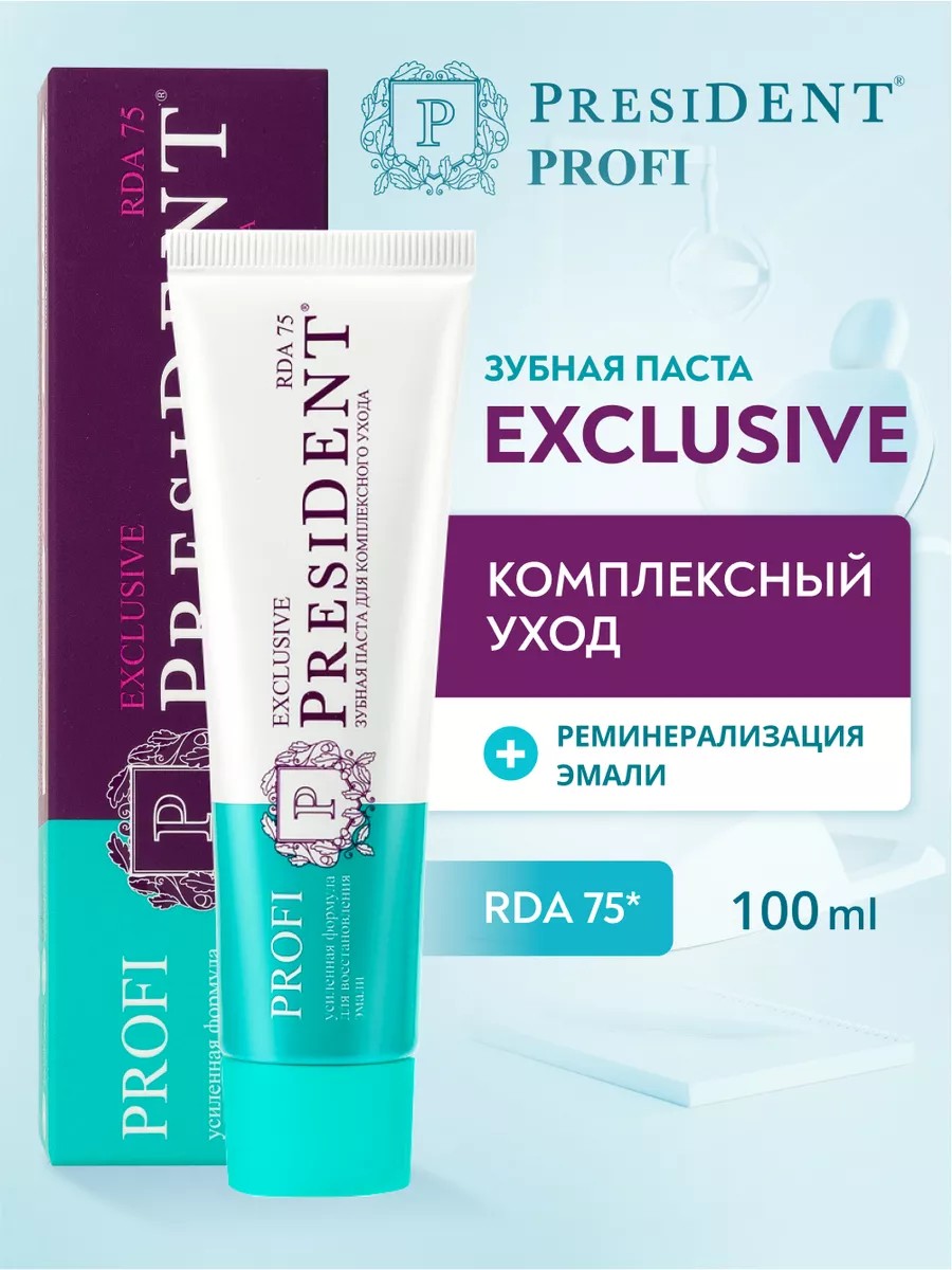 Профессиональная зубная паста PRESIDENT PROFI Exclusive c RDA 75 рекомендуется при различных воспалениях полости рта, а также при пониженном иммунитете, подходит для ежедневного применения.