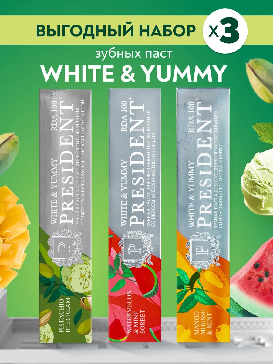 Линейка White & Yummy с RDA 100 - коллекция отбеливающих зубных паст с оригинальными вкусами десертов и освежающими нотками для ценителей изысканного ухода за полостью рта. Зубная паста PRESIDENT White & Yummy со вкусами арбузно-мятного сорбета, манго-мусс и мяты, фисташкового мороженого подходит для ежедневного отбеливания зубов. Паста осветляет эмаль, удаляет налет и стойкие пятна, защищает от образования зубного камня, освежает дыхание. Активные компоненты: пирофосфаты и трифосфат предупреждают образование зубного налета. Не содержат фтор. RDA - контролируемый показатель абразивности зубной пасты. Забота о здоровье всегда начинается с гигиены полости рта. Если есть возможность выбрать что-то натуральное, то обязательно это стоит делать. Зубная паста фруктовая, ореховая Президент подходит для брекетов, она не вызывает аллергии, дискомфорта и других неприятных последствий использования. Средства гигиены полости рта нашего бренда - это отличный подарок на на День рождения, юбилей и абсолютнос любой другой без исключения праздник, даже без какого-то особого повода, в знак внимания, любви и заботы. У нас есть акции и распродажи, Вы можете купить наши товары в подарок со скидкой.