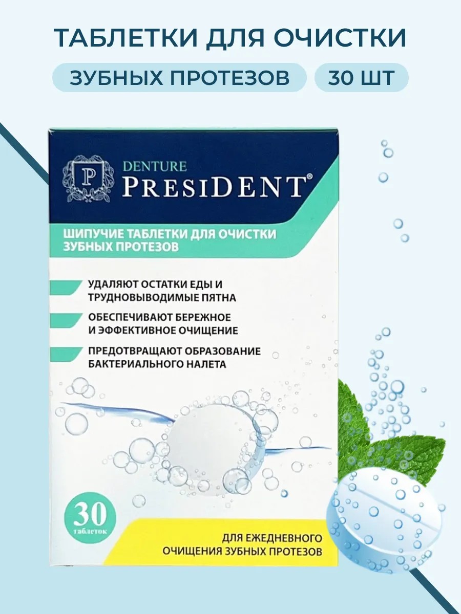 PRESIDENT DENTURE effervescent denture cleaning tablets are suitable for daily cleaning of removable, partial, and clasp dentures. Effervescent tablets quickly and effectively remove bacterial plaque and organic debris without damaging the denture material.