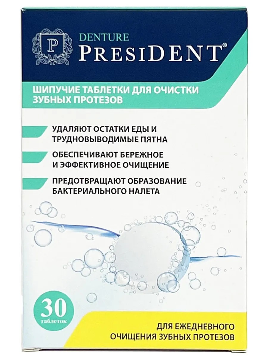 Таблетки для очищения зубных протезов President Denture шипучие, не повреждая протез механически, идеально очищают его даже в самых труднодоступных местах!