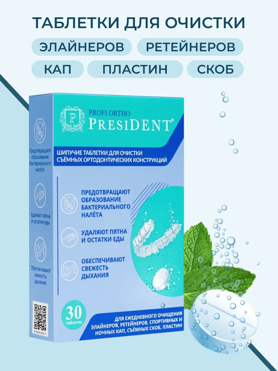 Шипучие таблетки для очистки съемных ортодонтических конструкций PresiDENT (Президент) PROFI ORTHO подходят для ежедневного очищения элайнеров, ретейнеров, спортивных и ночных кап, съёмных скоб, пластин.
