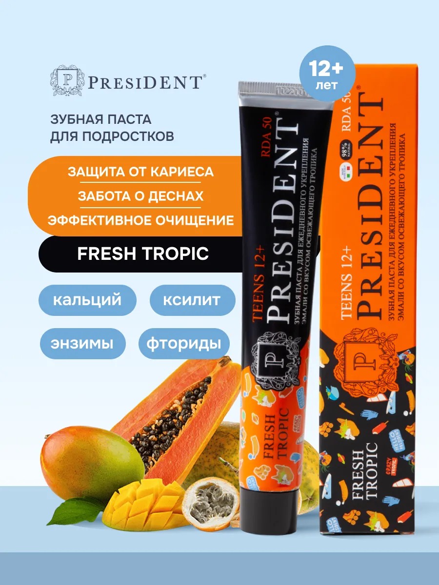 Зубная паста PresiDENT (Президент) Teens Fresh tropic с 12 лет обеспечивает длительный и эффективный уход за зубами. Стимулирует процесс реминерализации, предотвращает разрушение эмали и развитие кариеса.