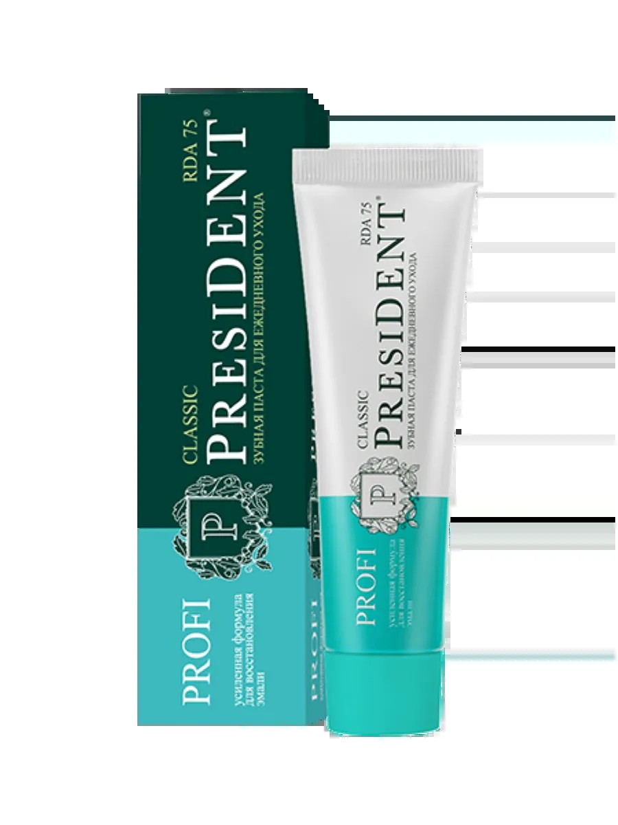 Professional toothpaste PRESIDENT PROFI Classic with RDA 75 is designed for daily care, helps preserve fillings and prevents caries in the restoration areas. Active ingredients: Hydroxyapatite is responsible for the process of remineralization of tooth enamel; Sage has an antiseptic effect; Chamomile relieves inflammation; Xylitol inhibits bacterial growth; Fluoride strengthens enamel and protects against caries; Mint freshens breath. Clinically proven effectiveness: Reduces plaque by 56%; Helps reduce periodontal inflammation by 65%; Reduces foci of enamel demineralization by up to 72%. Use: after each meal, at least twice a day. RDA is a controlled indicator of toothpaste abrasiveness. The toothpaste does not cause allergies, discomfort or other unpleasant consequences of use. The whitening toothpaste includes an ideal composition, which was created using innovative technologies. President toothpaste is natural and ideal for both teens and adults, taking up minimal space in your bathroom. It's perfect for traveling, ensuring you always feel confident and confident about your oral health. There's no need for professional whitening when choosing a quality toothpaste that meets all your needs is enough. A high-quality whitening toothpaste for cavities, plaque, and tartar will help you feel confident in any situation. Remember, dental health is something you should take care of constantly, not just occasionally. PROFESSIONAL TOOTHPASTE will help you solve many daily care and maintenance issues. And we'll help you find this essential product at attractive prices. We always offer special offers and additional discounts for great deals. Hurry and treat yourself to a professional toothpaste that will impress!