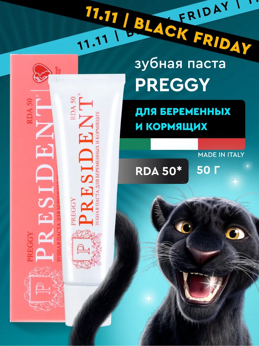 Зубная паста PRESIDENT PREGGY С RDA 50 рекомендуется для женщин в период беременности и кормления. В период беременности и кормления требуется усиленный и деликатный уход за зубами и деснами. Зубная паста не содержит SLS и парабенов. Содержание фторидов 850 ppm. Активные компоненты: бидроксиапатит реминерализует эмаль и снижает чувствительность; биодоступный кальций укрепляет эмаль; экстракт ламинарии укрепляет десны; мята обеспечивает свежее дыхание. Применение: после каждого приема пищи, не менее двух раз в день. RDA - контролируемый показатель абразивности зубной пасты. Забота о здоровье всегда начинается с гигиены полости рта. Потому что только при здоровых зубах можно гарантировать здоровье всего организма. Как этого добиться? Использовать качественные средства ухода, которые дадут хороший результат. Именно поэтому, наша зубная паста для чувствительных зубов так популярна среди ценителей действительно достойных товаров. Каждое средство President - это настоящее произведение искусства в сфере заботы о здоровье каждого человека. Если есть возможность выбрать что-то натуральное, то обязательно это стоит делать. Зубная паста не вызывает аллергии, дискомфорта и других неприятных последствий использования. Огромное количество людей по всему миру отдают предпочтение именно зубной пасте Президент, как универсальному средству, которое позволяет решить сразу несколько проблем. Ведь это борьба с кариесом, налетом, чувствительностью десен, все это решается за пару применений. Поэтому, обязательно стоит использовать эту пасту, как настоящий профессиональный уход и постараться, чтобы Ваши близкие тоже воспользовались таким привлекательным решением. Самое главное, что зубная паста надежная, она прошла все возможные тесты и испытания, прежде чем попасть на прилавки магазинов. Отбеливающая зубная паста включает в себя идеальный состав, который создавался с помощью инновационных технологий. Поспешите себя побаловать профессиональной пастой! Идеальный подарок на 8 марта.