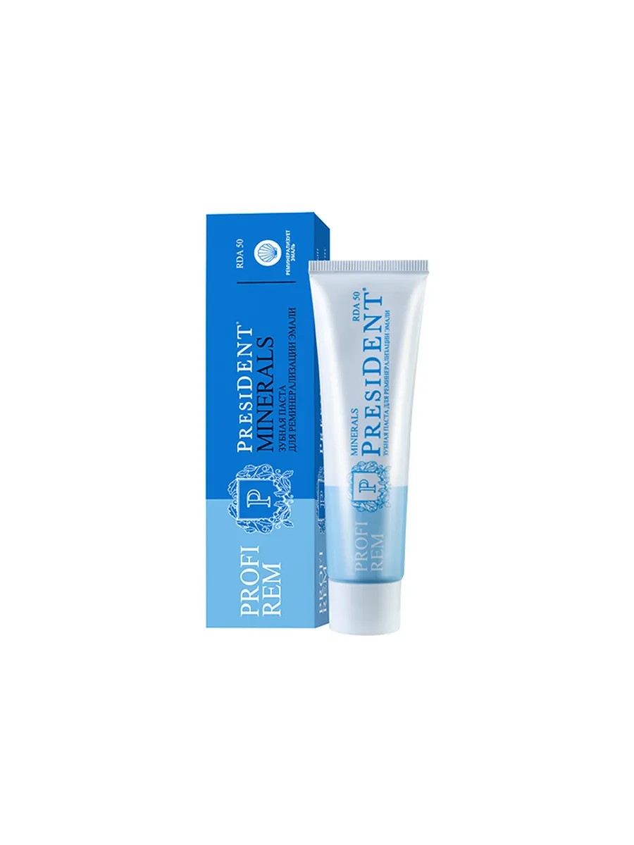 Бренд President - всё для ухода за полостью рта высокого качества и на профессиональном уровне. Линия Profi - Профессиональная коллекция - Коллекция специализированных средств по лечению и уходу за полостью рта. Для тех, кому нужен дополнительный уход за зубами и деснами. Президент Profi Rem Зубная паста Minerals - реминерализует эмаль и способствует снижению чувствительности Внешний вид и свойства: Консистенция - Гелевая Цвет - голубая Вкус - освежающая Комплекс Биодоступного Кальция с Жемчужной Пудрой и Гидроксиапатитом реминерализует эмаль и способствует снижению чувствительности, Ксилитол подавляет рост бактерий. 1 этап ситемы реминерализации President Profi REM Minerals. -Реминерализует эмаль, -Снижает риск развития кариеса, -Способствует снижению чувствительности, -Бережно и эффективно очищает. rda* - это строгий контроль за размером и концентрацией абразивных частиц. Абразивом являются сферолиты SYLOBLANC, которые безопасно и эффективно удаляют налёт, очищают и полируют зубную эмаль Специальные особенности: Не содержит фториды, sls, парабены.