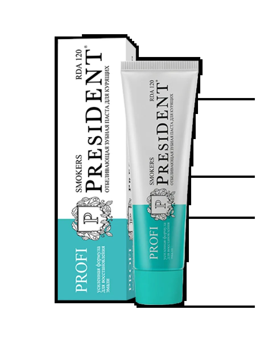 Профессиональная зубная паста PRESIDENT PROFI Smokers c RDA 120 рекомендована для устранения никотинового налета и запаха табачного дыма и подходит для ежедневного применения. Активные компоненты: Гидроксиапатит отвечает за процесс реминерализации зубной эмали:; Лайм осветляет эмаль; Мята и Петрушка освежают дыхание; Пудра бамбукового угля устраняет никотиновый налет и бережно отбеливает; Фтор укрепляет эмаль и защищает от кариеса. Применение: после каждого приема пищи, не менее двух раз в день. RDA - контролируемый показатель абразивности зубной пасты. Отбеливающая зубная паста включает в себя идеальный состав, который создавался с помощью инновационных технологий. Зубная паста President натуральная и отлично подходит для подростков и взрослых, не занимает много места среди других средств в ванной комнате. Пасту можно смело брать с собой в путешествия, чтобы всегда чувствовать себя уверенным и не переживать о здоровье полости рта. Качественная отбеливающая паста для зубов от кариеса и зубного налета и камня поможет чувствовать себя уверенно при любой ситуации. Многие опытные специалисты с уверенностью пользуются нашей профессиональной зубной пастой и советуют его своим клиентам. Это возможность сделать уход за полостью рта более эффективным и качественным. Пользоваться можно легко, для этого не требуется дополнительное оборудование, поэтому использовать данное средство всей семьей может стать приятной традицией. Помните, что здоровье зубов - это тот аспект, о котором стоит заботиться постоянно, а не от случая к случаю. ПРОФЕССИОНАЛЬНАЯ ЗУБНАЯ ПАСТА поможет решить множество проблем с ежедневной заботой и уходом. А мы поможем Вам приобрести столь достойный и необходимый товар по привлекательным ценам. Ведь мы всегда устраиваем акции и дополнительные скидки для выгодных приобретений. Поспешите себя побаловать профессиональной пастой, которая никого не оставит равнодушным!