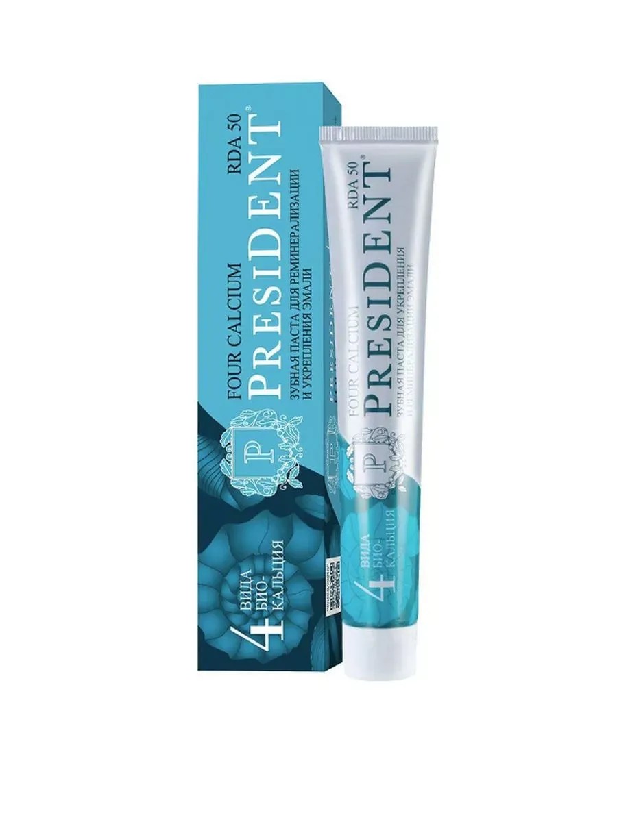 President Four Calcium, Зубная паста для реминерализации и укрепления эмали 75 мл. Уникальный комплекс из 4х видов биодоступного кальция реминерализует зубную эмаль, Папаин расщепляет белковый налет. Эффективность зубной пасты клинически доказана: Снижает чувствительность зубов до 76%; уменьшает количество налета на 47%; уменьшает воспаление десен на 57%. Абразивом являются сферолиты SYLOBLANC, которые безопасно и эффективно удаляют налёт, очищают и полируют зубную эмаль. Чем выше абразивность зубной пасты, тем лучше она будет счищать с поверхности эмали бактериальный и пигментированный налет.