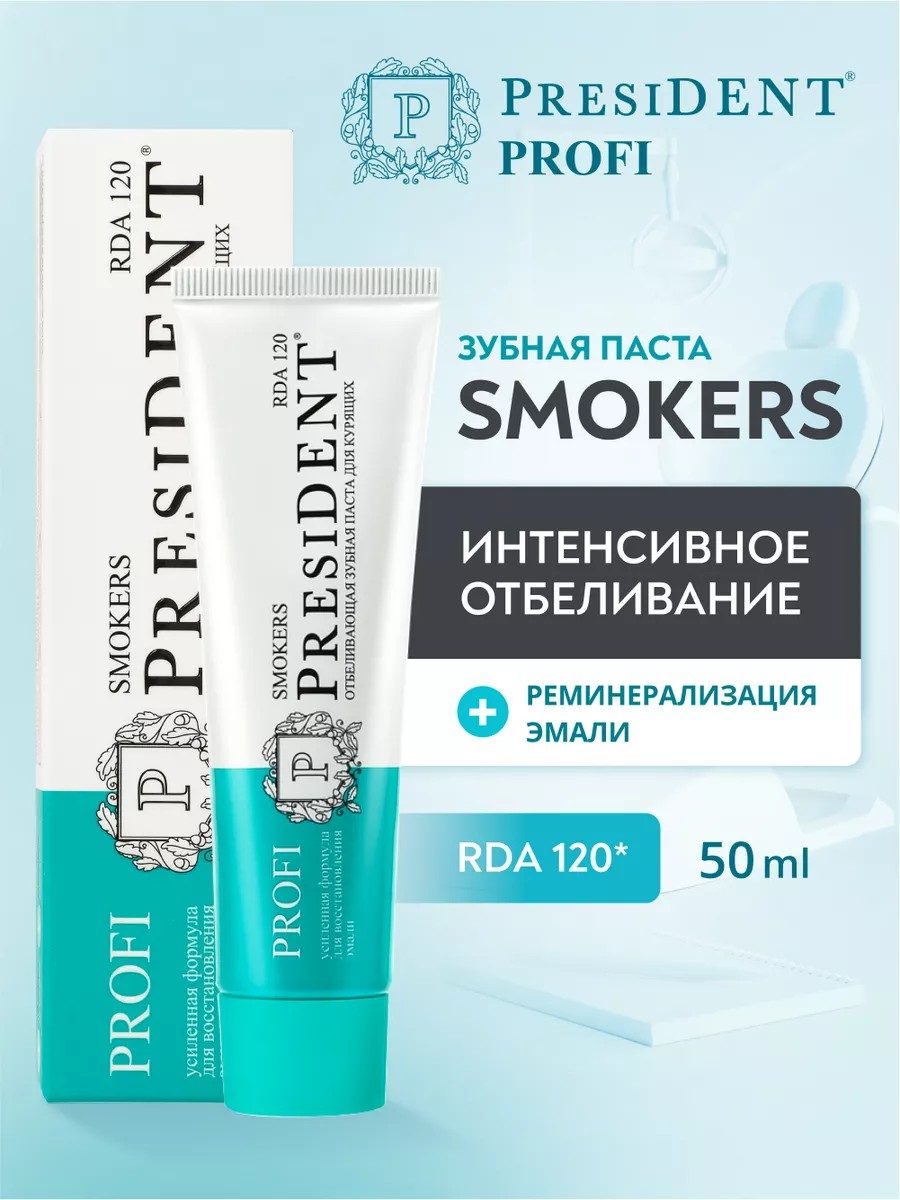 PRESIDENT PROFI Smokers professional toothpaste with RDA 120 is recommended for eliminating nicotine plaque and the smell of tobacco smoke and is suitable for daily use. Active ingredients: Hydroxyapatite is responsible for the process of remineralization of tooth enamel:; Lime brightens enamel; Mint and Parsley freshen breath; Bamboo charcoal powder removes nicotine plaque and gently whitens; Fluoride strengthens enamel and protects against caries. Application: after each meal, at least twice a day. RDA is a controlled indicator of toothpaste abrasiveness. This whitening toothpaste contains an ideal composition, which was created using innovative technologies. President toothpaste is natural and is perfect for teenagers and adults, it does not take up much space among other products in the bathroom. You can safely take the toothpaste with you on trips to always feel confident and not worry about your oral health. A high-quality whitening toothpaste for cavities, plaque, and tartar removal will help you feel confident in any situation. Many experienced professionals confidently use our professional toothpaste and recommend it to their clients. This is an opportunity to make oral care more effective and high-quality. Easy to use and requiring no additional equipment, using this product can become a pleasant tradition for the whole family. Remember, dental health is something that should be taken care of constantly, not just occasionally. PROFESSIONAL TOOTHPASTE will help solve many problems related to daily care and maintenance. And we will help you purchase this worthy and essential product at attractive prices. After all, we always offer promotions and additional discounts for great deals. Hurry and treat yourself to a professional toothpaste that will impress everyone!