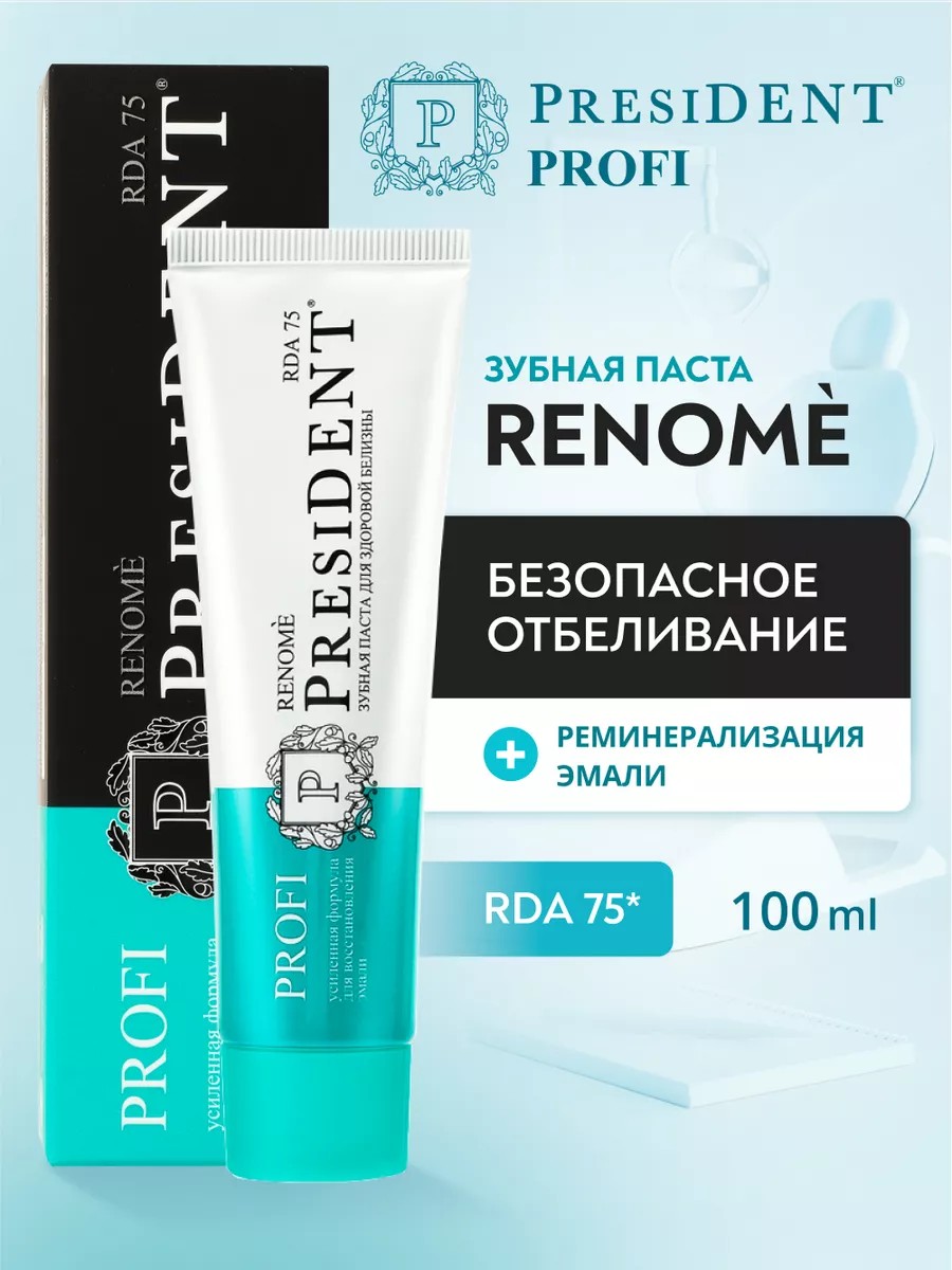PRESIDENT PROFI Renome professional toothpaste with RDA 75 is designed for gentle teeth whitening and is suitable for daily use. This toothpaste is recommended for maintaining the effect of professional cleaning at the dentist, does not contain harsh abrasives or peroxide compounds. Active ingredients: Hydroxyapatite is responsible for the process of remineralization of tooth enamel:; Calcium-silicon composition effectively cleans enamel and gently removes plaque; Ginseng has a toning effect; Fluoride strengthens enamel and protects against caries; Mint freshens breath. Clinically proven effectiveness: reduces plaque by 62%, and pigmented plaque by 53%. Use: after each meal, at least twice a day. RDA is a controlled indicator of toothpaste abrasiveness. Most importantly, the toothpaste is reliable; it passed all possible tests and trials before hitting store shelves. This whitening toothpaste features an ideal formula created using innovative technologies. President toothpaste is natural and ideal for both teens and adults, taking up minimal space among other bathroom products. This high-quality whitening toothpaste fights cavities, plaque, and tartar, helping you feel confident in any situation. It's easy to use and requires no additional equipment, making it a fun family tradition. Remember, dental health is something you should take care of regularly, not just occasionally. PROFESSIONAL TOOTHPASTE will help you solve many daily care and maintenance issues. We'll help you find this essential product at attractive prices. We always offer special offers and additional discounts for great deals. Hurry and treat yourself to a professional toothpaste that will impress everyone!