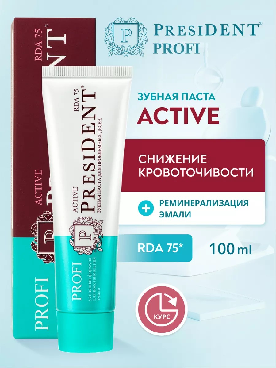 Профессиональная зубная паста PRESIDENT PROFI Active c RDA 75 - это курсовая паста для проблемных десен. Рекомендована при пародонтозе и пародонтите. Активные компоненты: Гидроксиапатит отвечает за процесс реминерализации зубной эмали; Цитрат Цинка обладает вяжущим действием и уменьшает кровоточивость; Экстракты Боярышника и Сангвинарии укрепляют капилляры и повышают иммунитет; Триклозан подавляет рост бактерий; Мята освежает дыхание. Эффективность клинически доказана: Уменьшает воспаление десен на 70%; Снижает кровоточивость на 76%; Снижение количества пародонтопатогенных бактерий до 0%. Применение: после каждого приема пищи, не менее двух раз в день. RDA - контролируемый показатель абразивности зубной пасты. Забота о здоровье всегда начинается с гигиены полости рта. Потому что только при здоровых зубах можно гарантировать здоровье всего организма. Зубная паста не вызывает аллергии, дискомфорта и других неприятных последствий использования. Отбеливающая зубная паста включает в себя идеальный состав, который создавался с помощью инновационных технологий. Зубная паста President натуральная и отлично подходит для подростков и взрослых, не занимает много места среди других средств в ванной комнате. Не нужно делать профессиональных отбеливаний, когда достаточно подобрать достойную пасту, которая будет соответствовать всем Вашим требованиям. Качественная отбеливающая паста для зубов от кариеса и зубного налета и камня поможет чувствовать себя уверенно при любой ситуации. Помните, что здоровье зубов - это тот аспект, о котором стоит заботиться постоянно, а не от случая к случаю. ПРОФЕССИОНАЛЬНАЯ ЗУБНАЯ ПАСТА поможет решить множество проблем с ежедневной заботой и уходом. А мы поможем Вам приобрести столь достойный и необходимый товар по привлекательным ценам. Ведь мы всегда устраиваем акции и дополнительные скидки для выгодных приобретений. Поспешите себя побаловать профессиональной пастой, которая никого не оставит равнодушным!